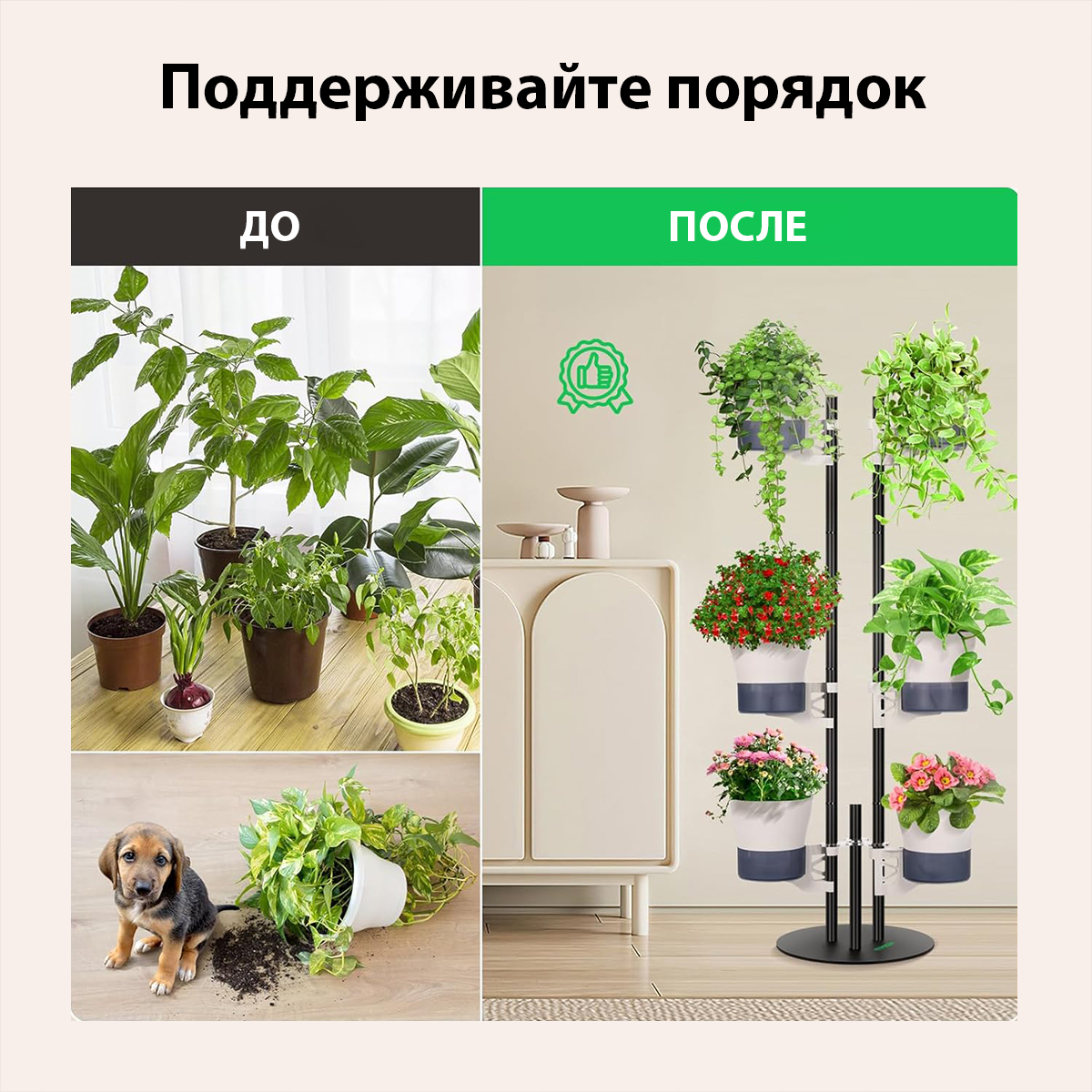 Вертикальное размещение максимально экономит пространство и подходит для углов и узких мест. Подняв кашпо над землёй, изделие помогает поддерживать порядок и добавляет элегантную, естественную нотку интерьеру.