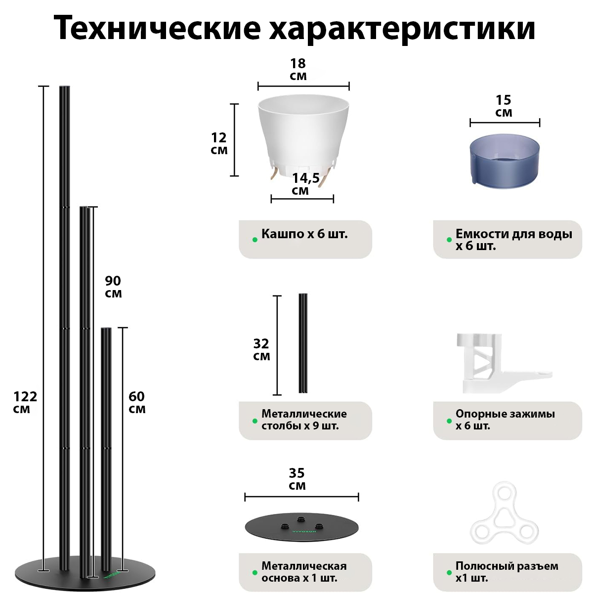 Комплект включает 9 металлических труб, 1 основание из металла, 6 кашпо, 6 лотков для самополива, 6 креплений-скоб, 1 соединитель для стоек.