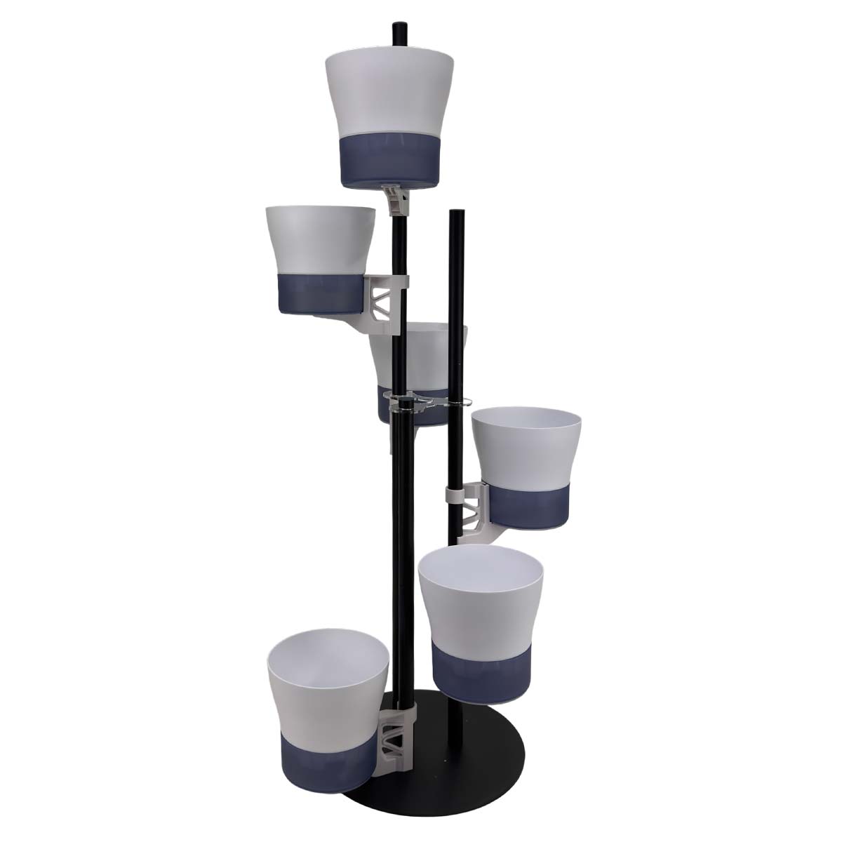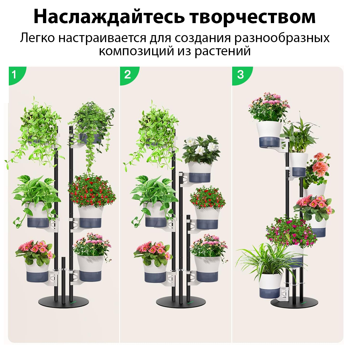 Полностью регулируемая конструкция подходит для разных растений, обеспечивая достаточную вентиляцию. Вы сами решаете как разместить каждое кашпо и общую высоту стойки, создавая стильные компоновки и эффектную визуальную композицию.