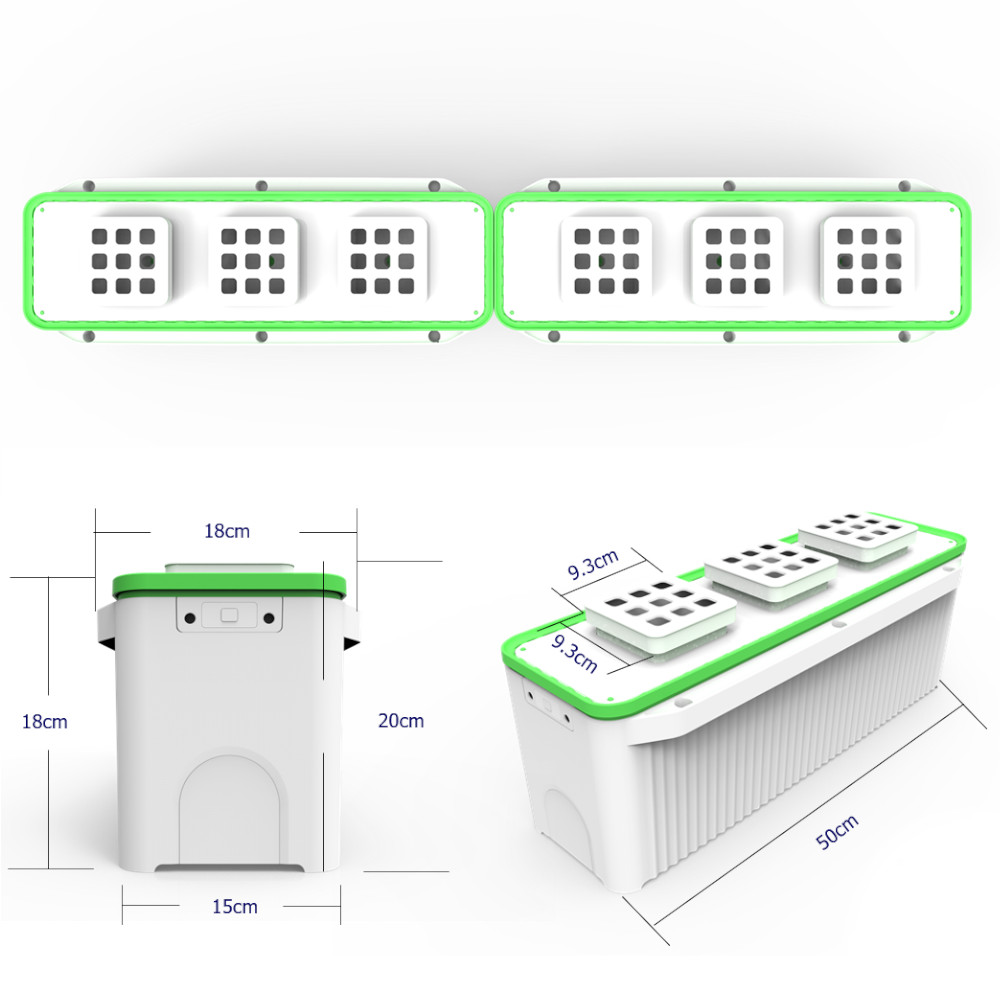 В комплекте: белый резервуар для воды размером 50х18х20 см (6,5 л), зеленый резервуар с 3 контейнерами для растений с вермикулитом и с крышками для проращивания, световые индикаторы подключения и уровня воды, сетевой адаптер 220 Вт, инструкция на русском.