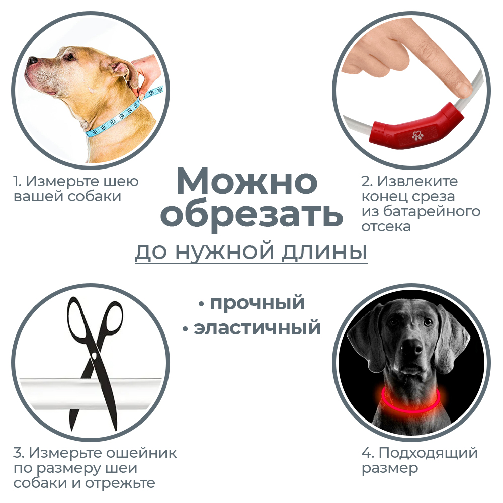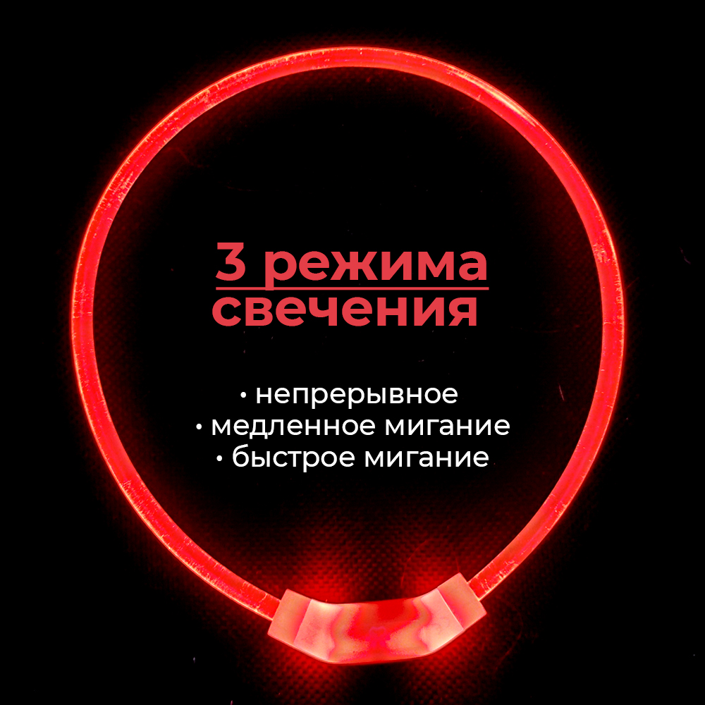 Прочный светящийся светодиодный ошейник предназначен для ночных прогулок, обеспечит безопасность и видимость собаки в темное время суток. Прозрачный силиконовый ошейник с красным свечением закрепляется при помощи винтовой пряжки, длину можно легко отрегулировать просто отрезав свободный край ошейника.