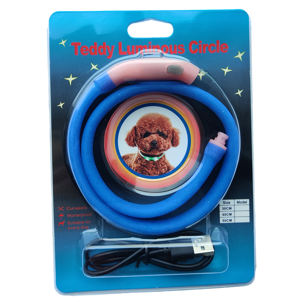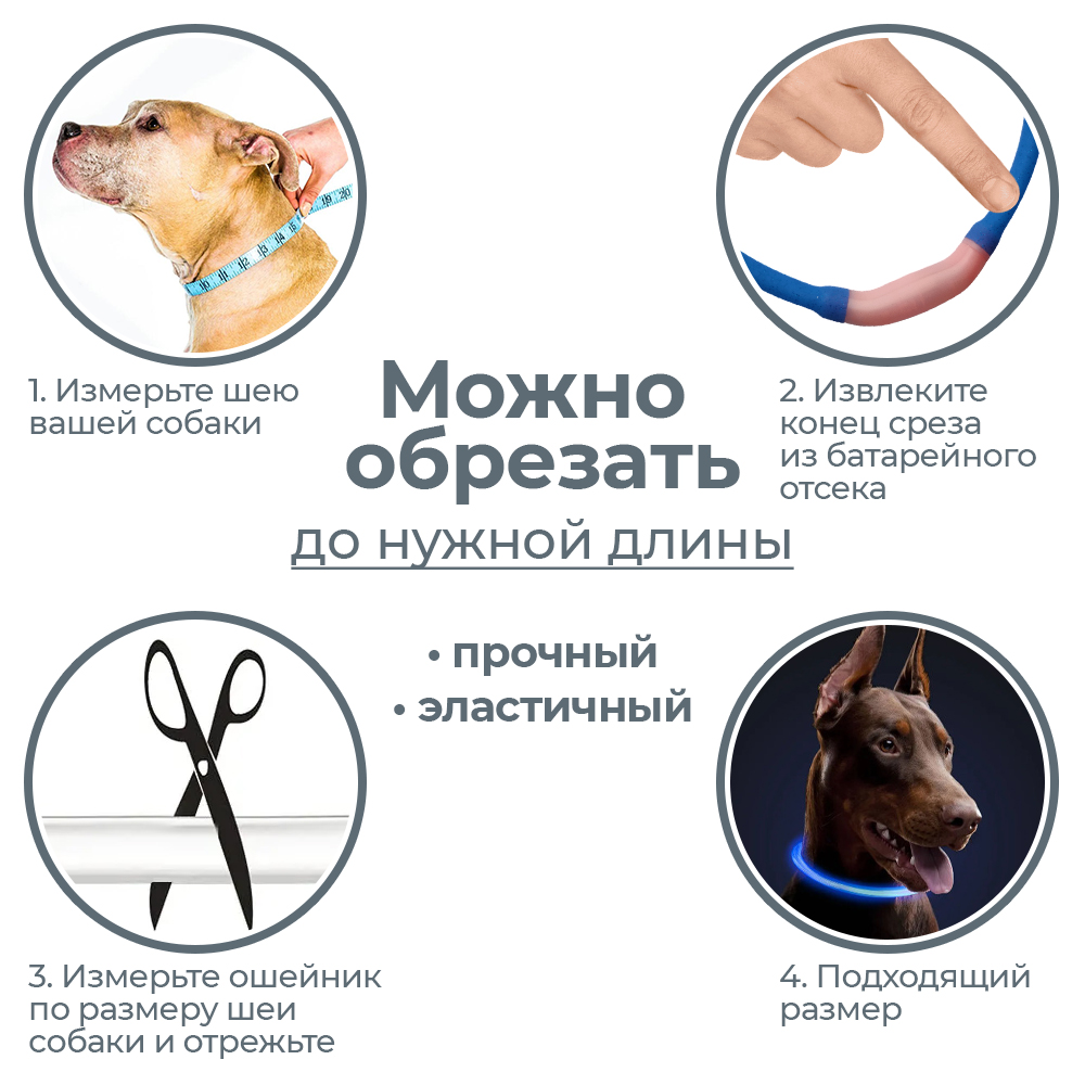 Прочный светящийся светодиодный ошейник предназначен для ночных прогулок, обеспечит безопасность и видимость собаки в темное время суток. Ошейник закрепляется при помощи защелкивающейся пряжки, длину можно легко отрегулировать просто отрезав свободный край ошейника.