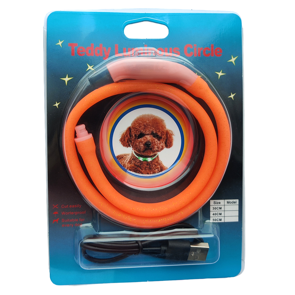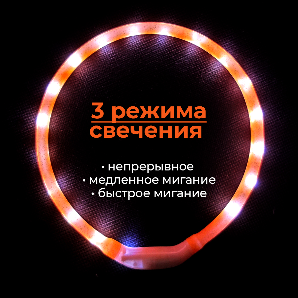 Прочный светящийся светодиодный ошейник предназначен для ночных прогулок, обеспечит безопасность и видимость собаки в темное время суток. Ошейник закрепляется при помощи защелкивающейся пряжки, длину можно легко отрегулировать просто отрезав свободный край ошейника.