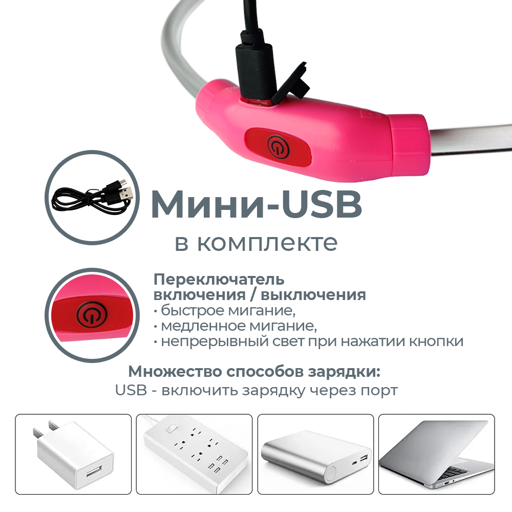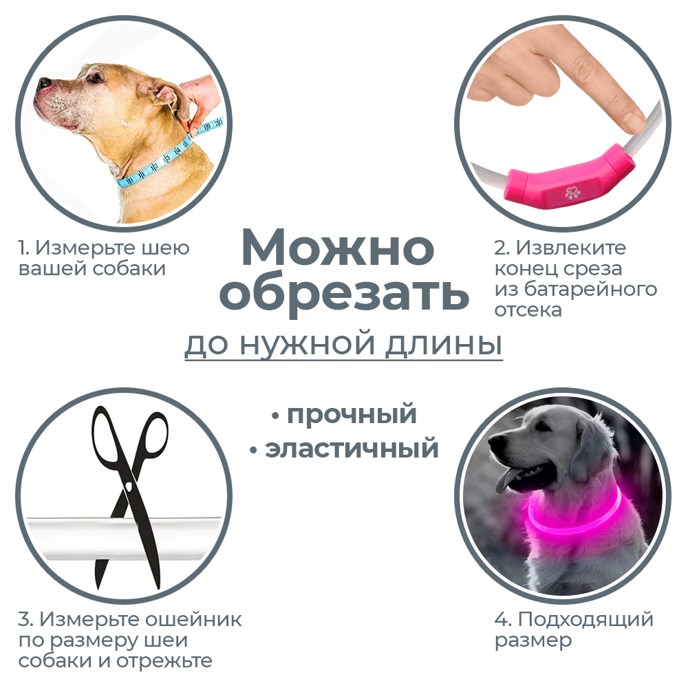 Прочный светящийся светодиодный ошейник предназначен для ночных прогулок, обеспечит безопасность и видимость собаки в темное время суток. Прозрачный силиконовый ошейник с розовым свечением закрепляется при помощи винтовой пряжки, длину можно легко отрегулировать просто отрезав свободный край ошейника.
