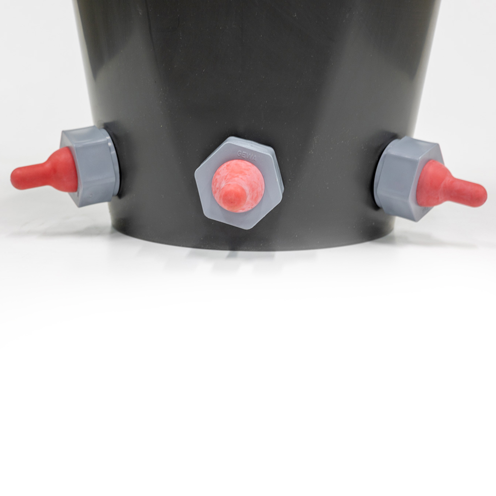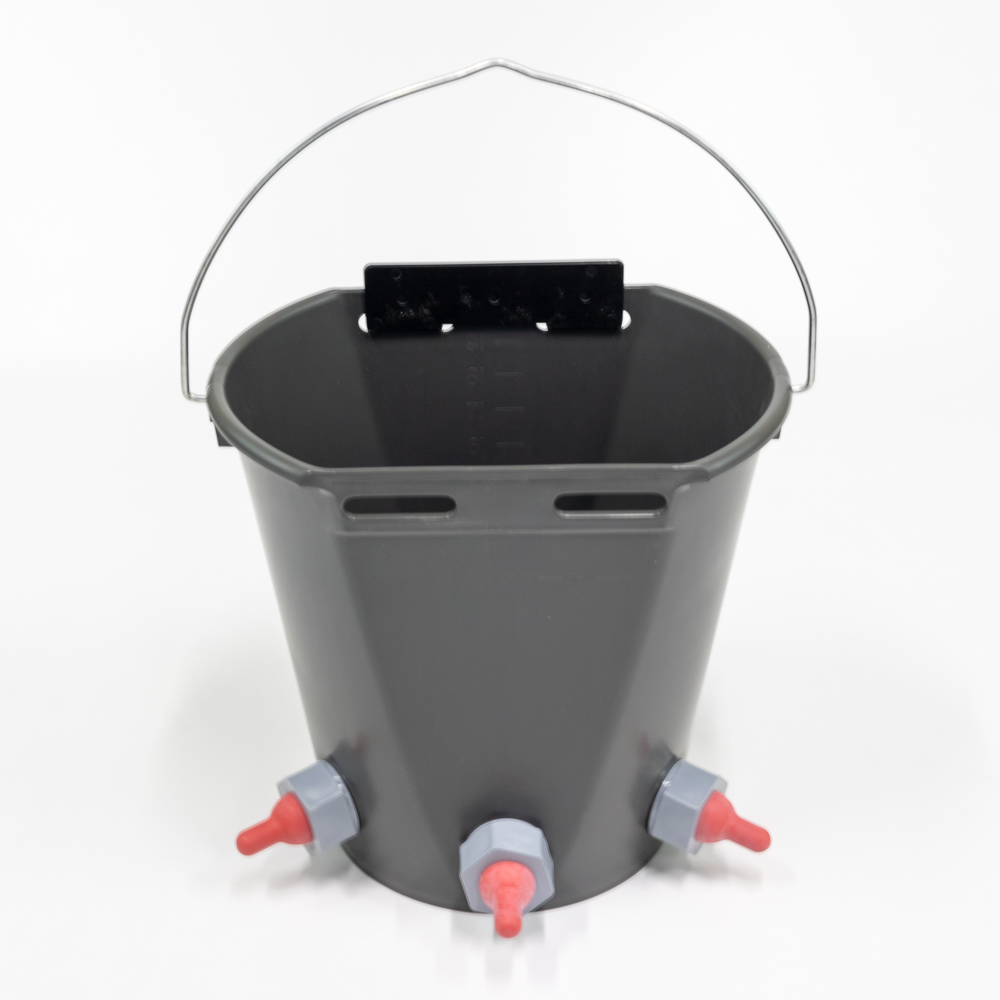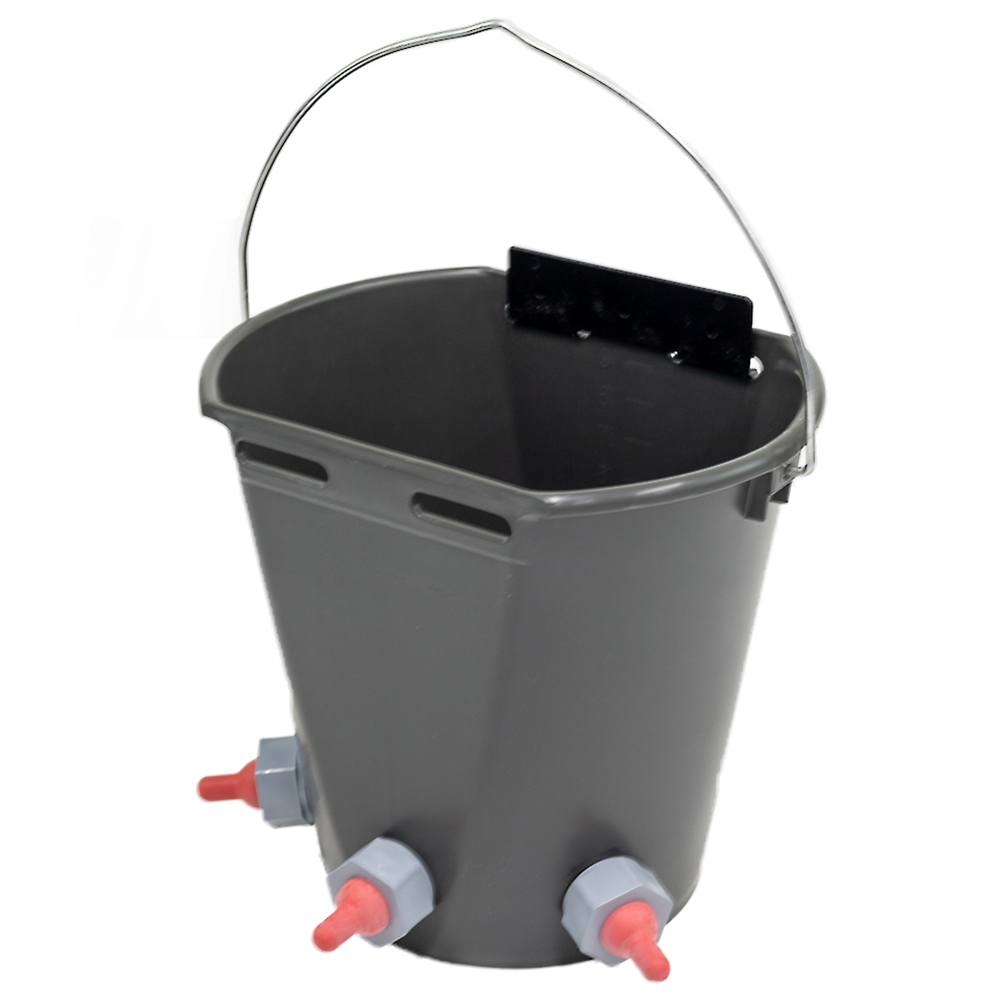 Ведро для поения ягнят, жеребят, телят укомплектовано 3 сосками и ручкой. Сделано из пластика совместимого с продуктами питания. Ведро имеет плоские стенки с лицевой и задней стороны. Внутри ведра имеется градуировка объёма в литрах. Клапана. Пластиковый крепеж ведра на стену.