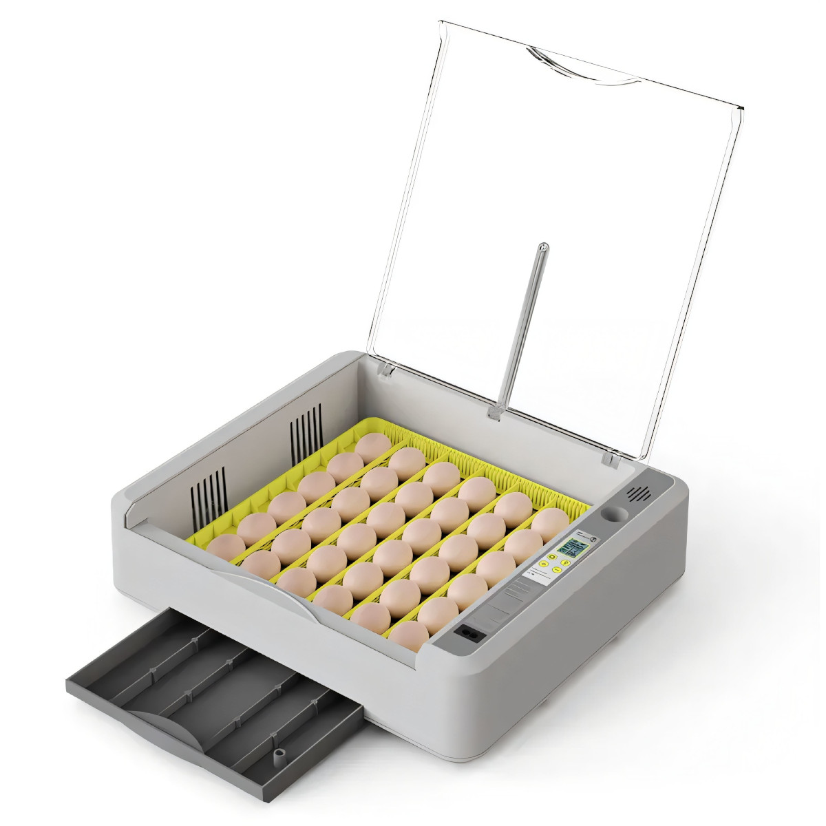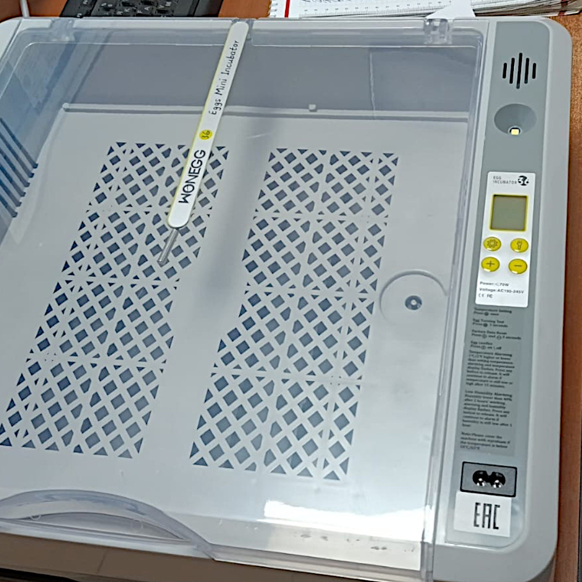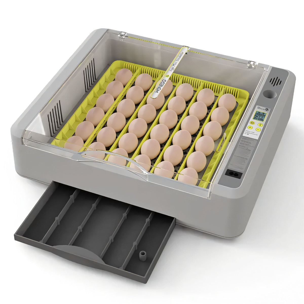 Автоматический инкубатор HHD 36 с автоматическим поворотом яиц и встроенным овоскопом. Хороший выбор для небольшого подсобного хозяйства. Инкубатор прост в использовании. Необходимо подключить его к сети, задать температуру и налить необходимое количество теплой воды в гидролоток для поддержания требуемой влажности. Прибор в течение нескольких минут при помощи встроенного ТЭНа и термостата доведет температуру в инкубационной камере до заданного значения. После этого можно закладывать предварительно отобранные яйца в лоток. Крышка не снимается полностью, а крепится на петлях. Сама крышка прозрачная, чтобы было удобно наблюдать за инкубационным процессом. Тревожная сигнализация при отклонении температуры и влажности от заданных значений.