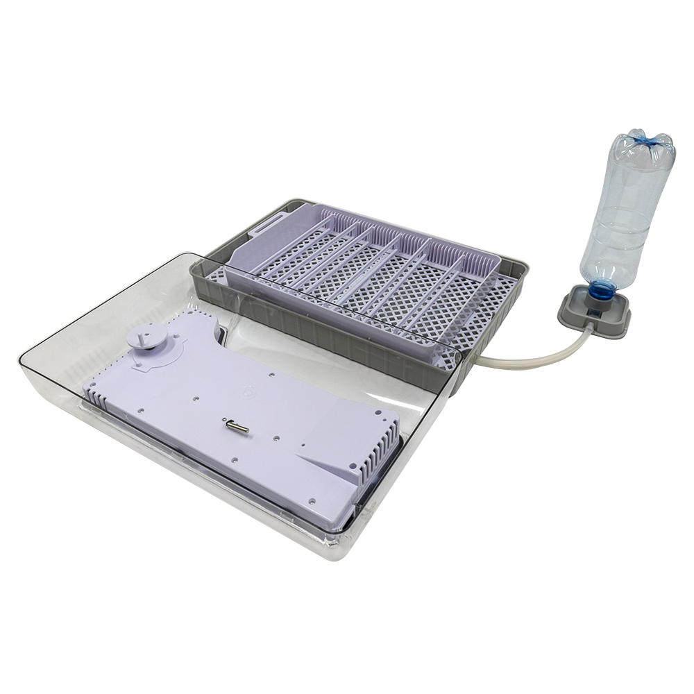- Внешнее подключение емкости с водой для обеспечения сбалансированной влажности внутри инкубатора в процессе инкубации (в комплект не входит бутылка) — 1 шт.