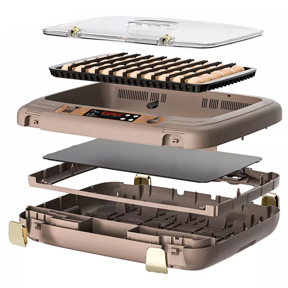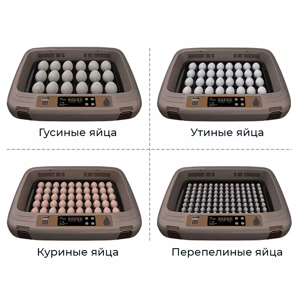 Автоматический инкубатор c универсальным поддоном и разделительными рейками. Подходит для куриных, перепелиных, утиных, гусиных, фазаньих яиц, а также яиц других видов птицы.