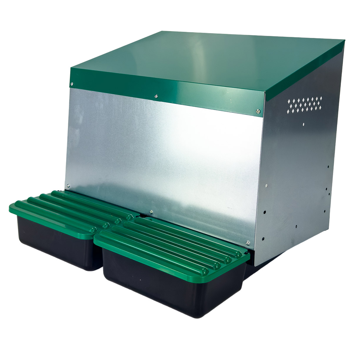 Гнездо для кур несушек наружное крепление HobbyFarm MG02-S состоящее из 2 секций. Изготовлено из оцинкованной стали и пластика. Устанавливается снаружи курятника. Яйца скатываются в отдельный яйцесборник с отверстиями для вентиляции. Благодаря обособленному яйцесборнику, яйца можно легко доставать снаружи. Особенности: прочность, практичность, отдельный яицесборник, предотвращает расклевывание яиц, легко устанавливается.