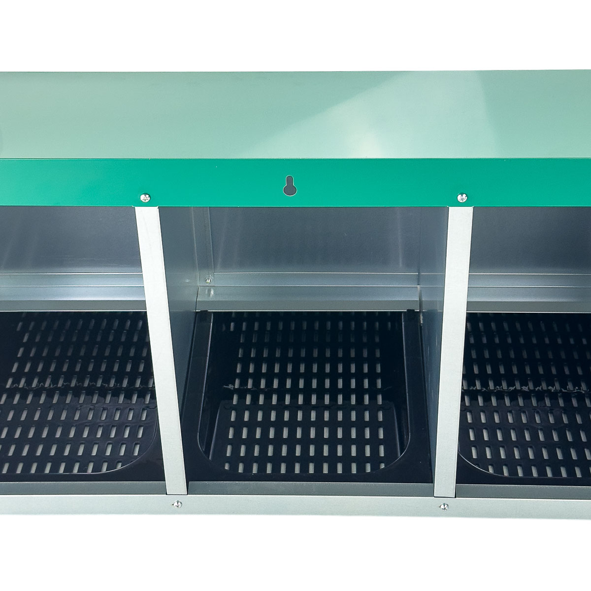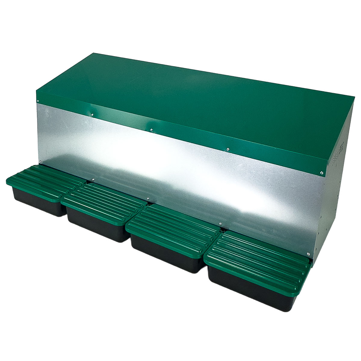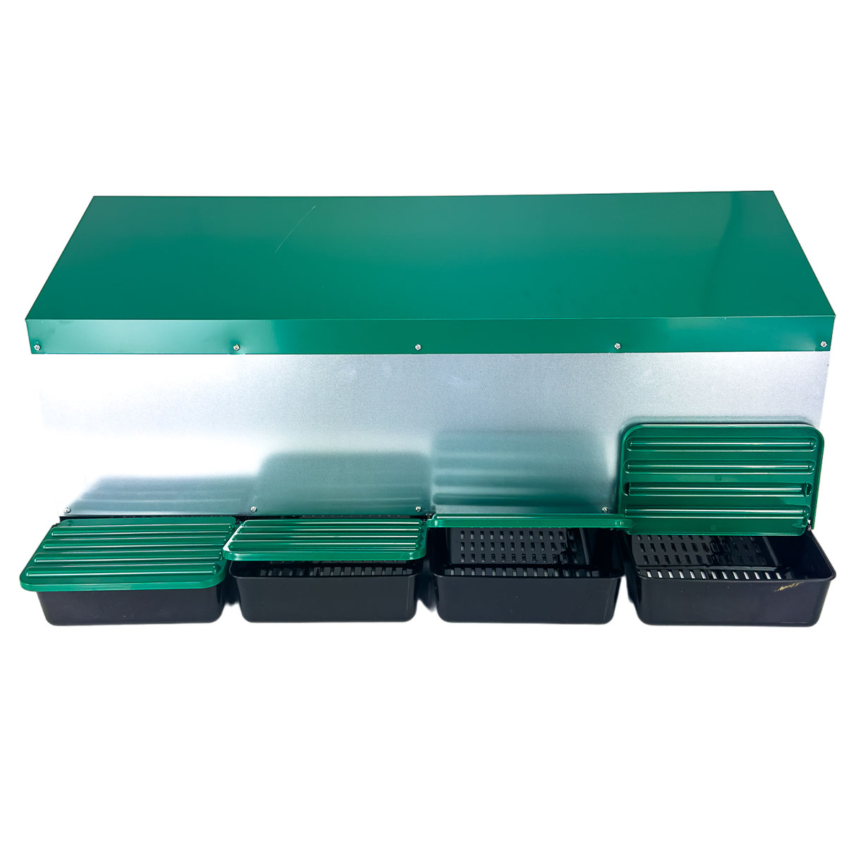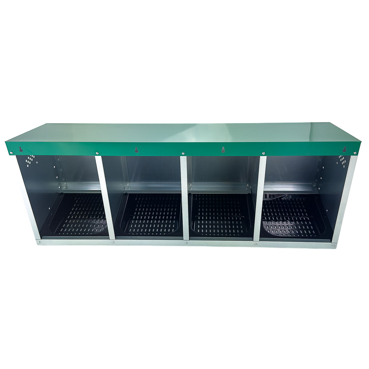 Гнездо для кур несушек наружное крепление HobbyFarm MG04-S состоящее из 4 секций. Изготовлено из оцинкованной стали и пластика. Устанавливается снаружи курятника. Яйца скатываются в отдельный яйцесборник с отверстиями для вентиляции. Благодаря обособленному яйцесборнику, яйца можно легко доставать снаружи. Особенности: прочность, практичность, отдельный яицесборник, предотвращает расклевывание яиц, легко устанавливается.