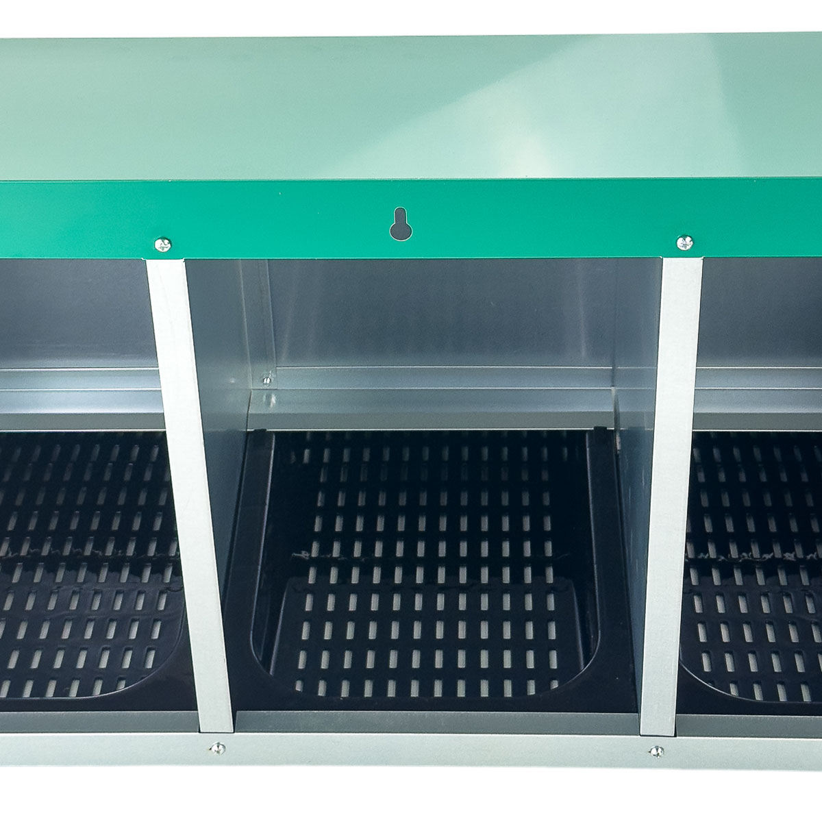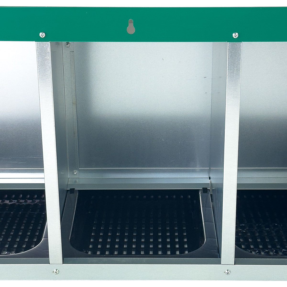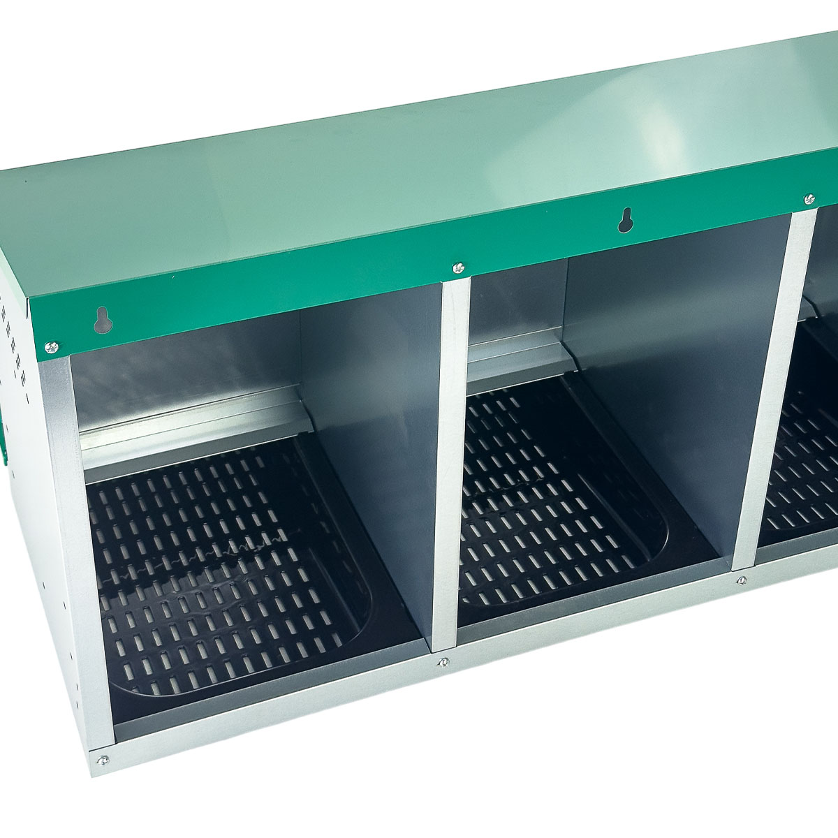 Гнездо для кур несушек наружное крепление HobbyFarm MG04-S состоящее из 4 секций. Изготовлено из оцинкованной стали и пластика. Устанавливается снаружи курятника. Яйца скатываются в отдельный яйцесборник с отверстиями для вентиляции. Благодаря обособленному яйцесборнику, яйца можно легко доставать снаружи. Особенности: прочность, практичность, отдельный яицесборник, предотвращает расклевывание яиц, легко устанавливается.