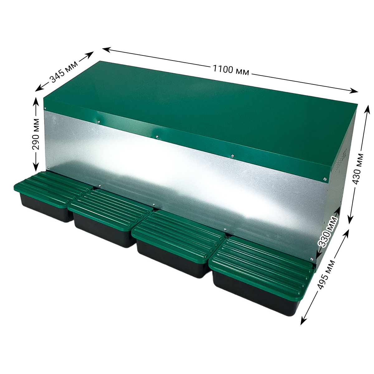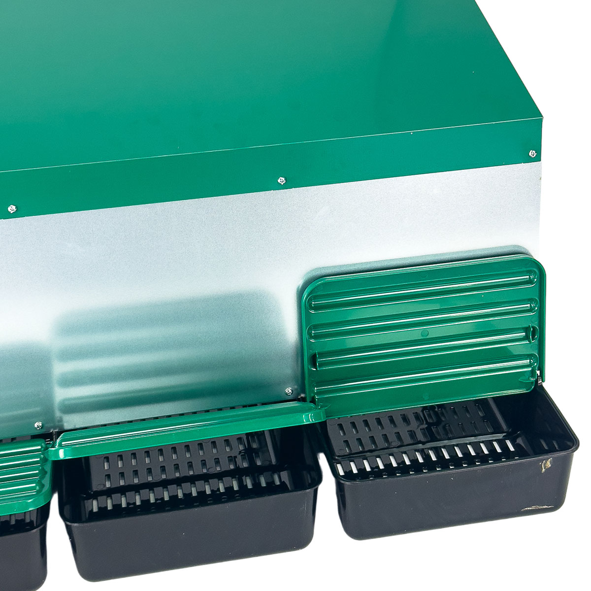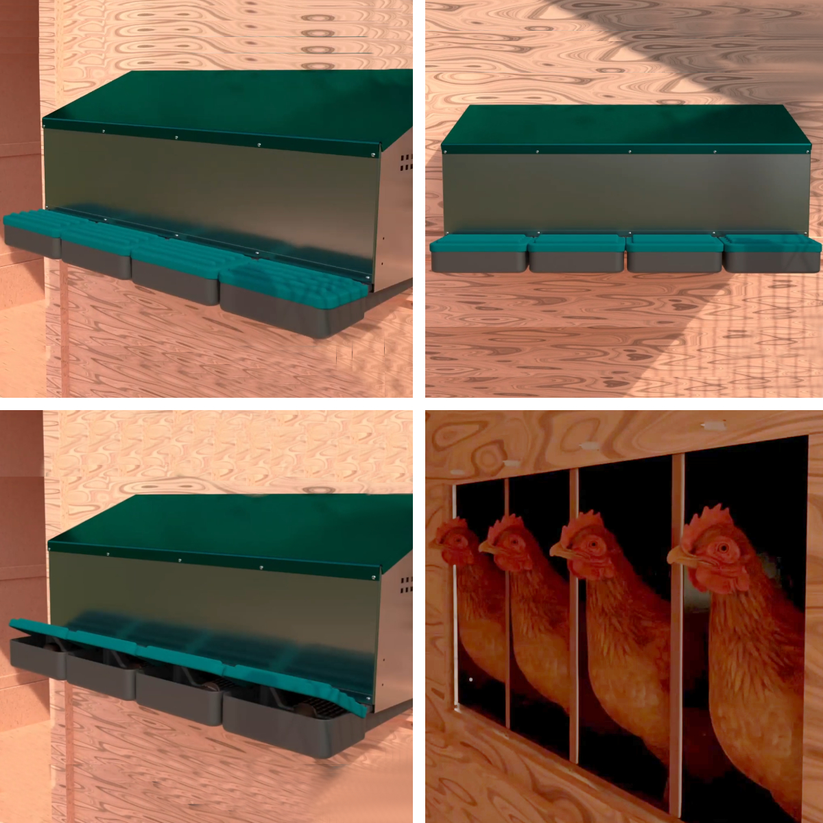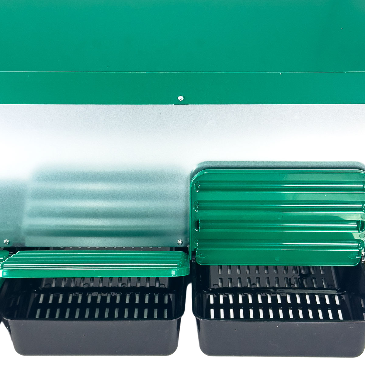 Гнездо для кур несушек наружное крепление HobbyFarm MG04-S состоящее из 4 секций. Изготовлено из оцинкованной стали и пластика. Устанавливается снаружи курятника. Яйца скатываются в отдельный яйцесборник с отверстиями для вентиляции. Благодаря обособленному яйцесборнику, яйца можно легко доставать снаружи. Особенности: прочность, практичность, отдельный яицесборник, предотвращает расклевывание яиц, легко устанавливается.
