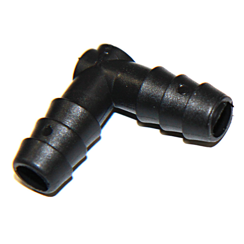 Соединение угловое для монтажа мягких труб и шлангов диаметром 10 мм с поперечными насечками. Переходник – соединитель угловой, из высококачественного итальянского пластика черного цвета.