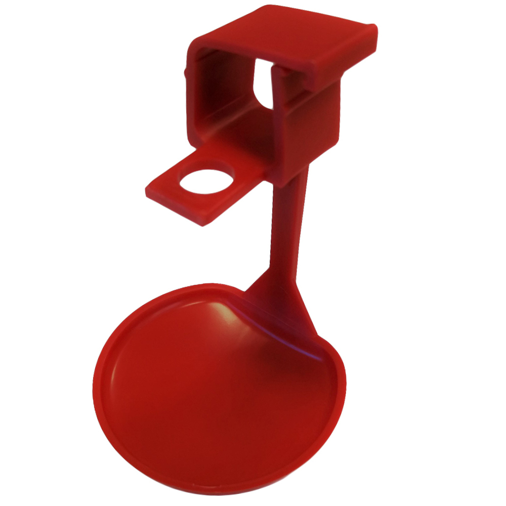 Каплеуловитель для трубы 22х22 мм линий ниппельного поения, на одной ножке, из глянцевого пластика красного цвета, итальянского производства.