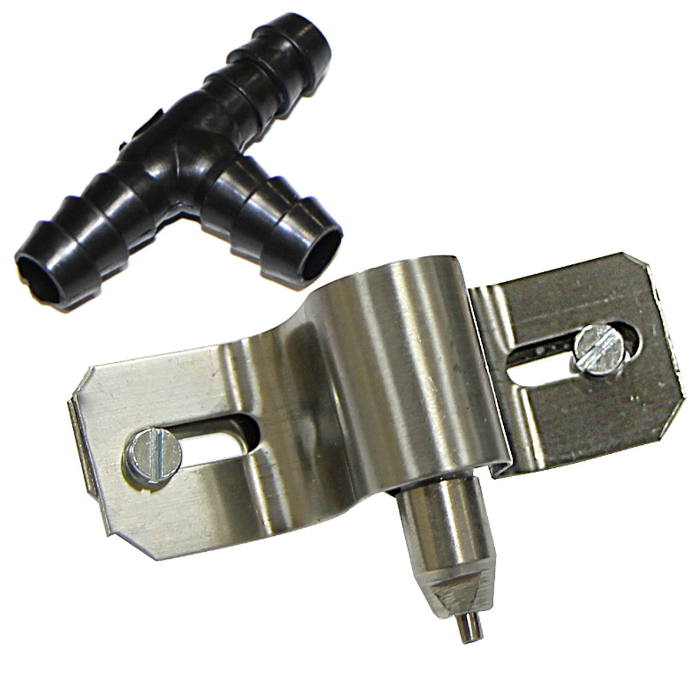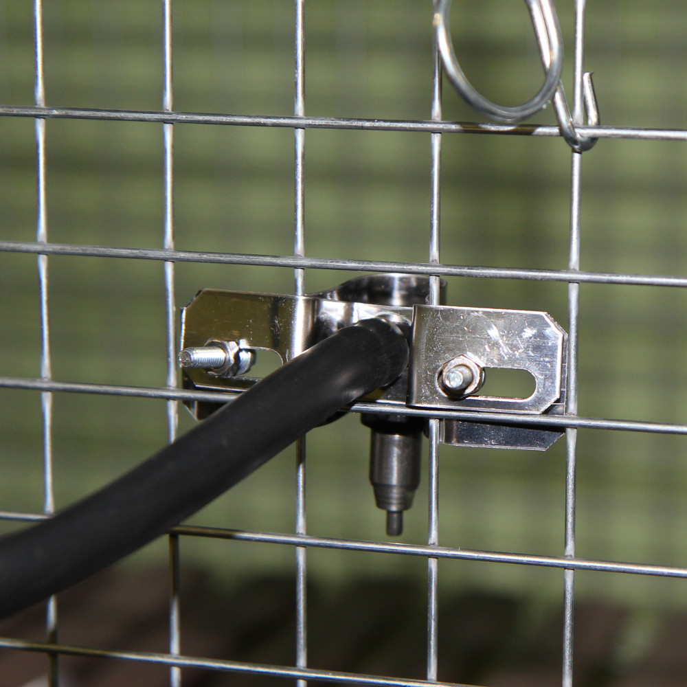 Поилка ниппельная для кур и кроликов из нержавеющей стали. Ниппель, через пластиковый переходник с насечками соединяется со шлангом, а крепится непосредственно на сетку клетки металлическим креплением на шурупах. Поилка укомплектована пластиковым Т-образным соединением с насечками для разводки шлангов или мягких труб.