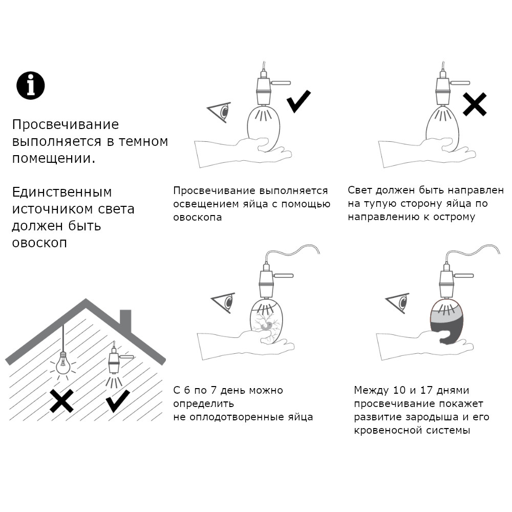 Для просмотра овоскоп подключают к сети, клавишу включения переводят в рабочее положение. Инкубационное яйцо удобно располагают в одной ладони, а другой рукой за ручку удерживают овоскоп над яйцом, просвечивая его сверху.