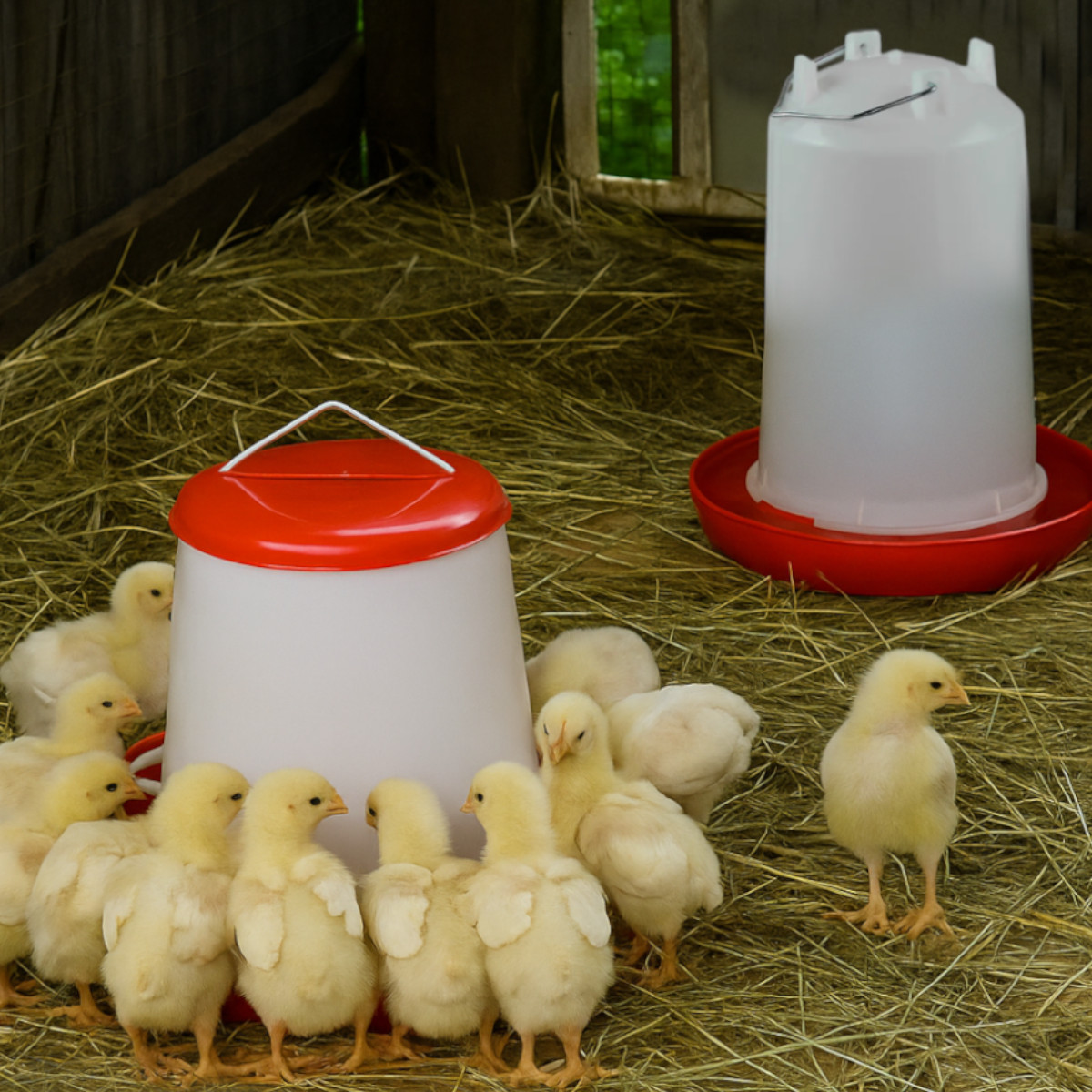 Набор для кур состоит из вакуумной поилки 8 л (YL5338-8) и бункерной кормушки 9 кг (YL5106-9).