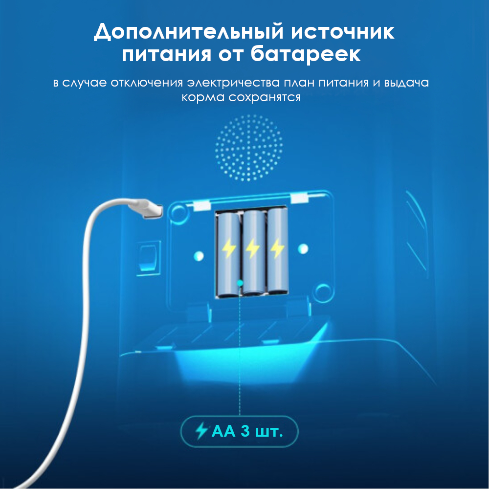 Автоматическая кормушка Pawgether работает от сети 220В, но имеет дополнительный источник питания от батареек АА x 3 шт. на случай отключения электричества. План питания и выдача корма сохранятся при отключении электричества.
