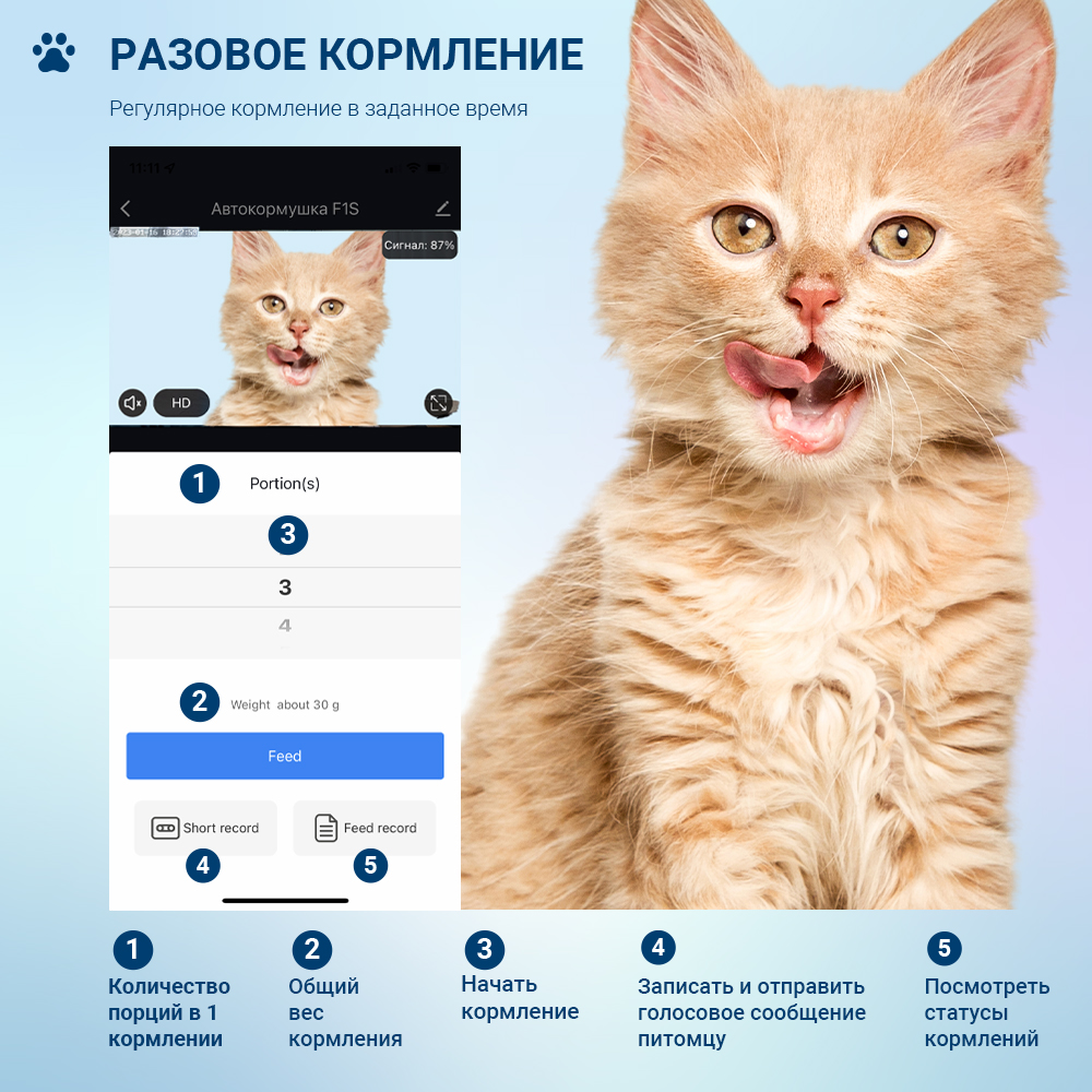 Теперь вы сможете позаботится о вашем питомце, находясь вне дома. С помощью специального приложения, пользуясь вашим телефоном или планшетом на базе IOS или Android, в режиме онлайн. С помощью встроенной видеокамеры можно общаться с питомцем в режиме реального времени, угостить питомца внеплановым кормлением, указав необходимую порцию, а также делать фото и записывать видео.