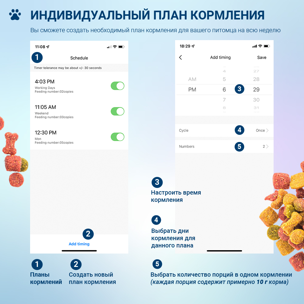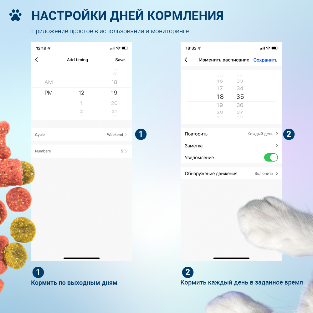 Вы сможете создать необходимый план кормления для вашего питомца на всю неделю, количество кормлений на каждый день, необходимую порцию и время для каждого кормления. Или можно установить регулярные кормления в заданное время каждый день, будним или выходным дням. Возможности автокормушки по настройке плана кормления подойдут для любого животного.