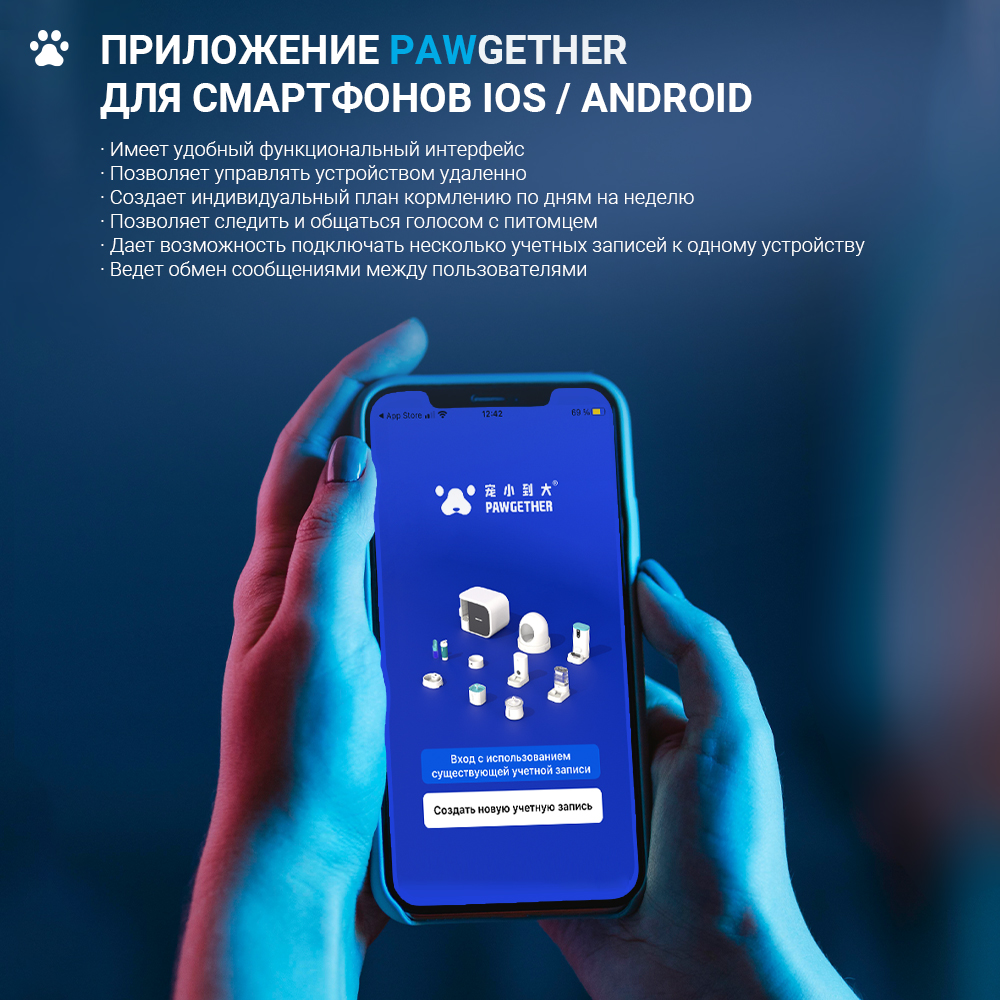 Специальное приложение Pawgether имеет удобный функциональный интерфейс, что позволяет управлять устройством удаленно, создавать индивидуальный план кормлению по дням на неделю, а так же следить и общаться голосом с питомцем. Приложение Pawgether позволяет подключать несколько учетных записей к одному устройству и вести обмен сообщениями между пользователями.