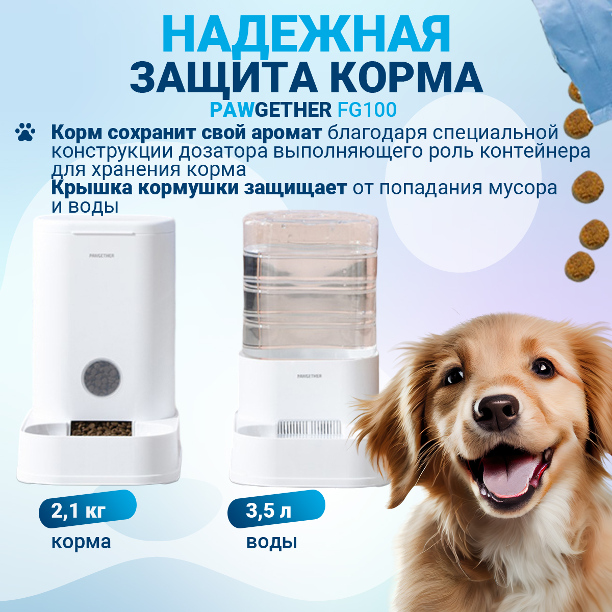 Автоматическая кормушка Pawgether FG100, 3,5 л поможет организовать питание питомца. Сухой корм засыпают в емкость кормушки через верхнее отверстие. Постепенно высыпаясь из бункера под действием собственного веса, корм наполняет поддон. Крышка кормушки защищает содержимое резервуара от попадания мусора и воды. Корм сохранит свой аромат благодаря специальной конструкции дозатора, выполняющего роль контейнера для хранения корма. Есть отделение для осушителя (сам силикагель в комплектацию не входит). Подходит для гранул всех форм. Дно чаши имеет противоскользящие прокладки, препятствующие скольжению миски во время приема пищи. Конструкция легко разбирается и моется.
