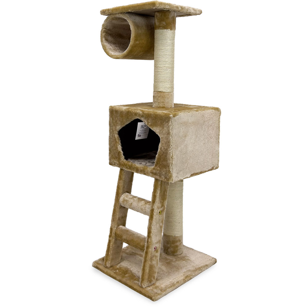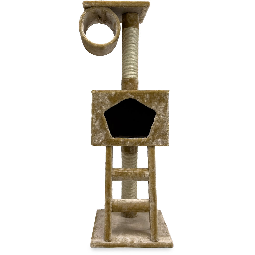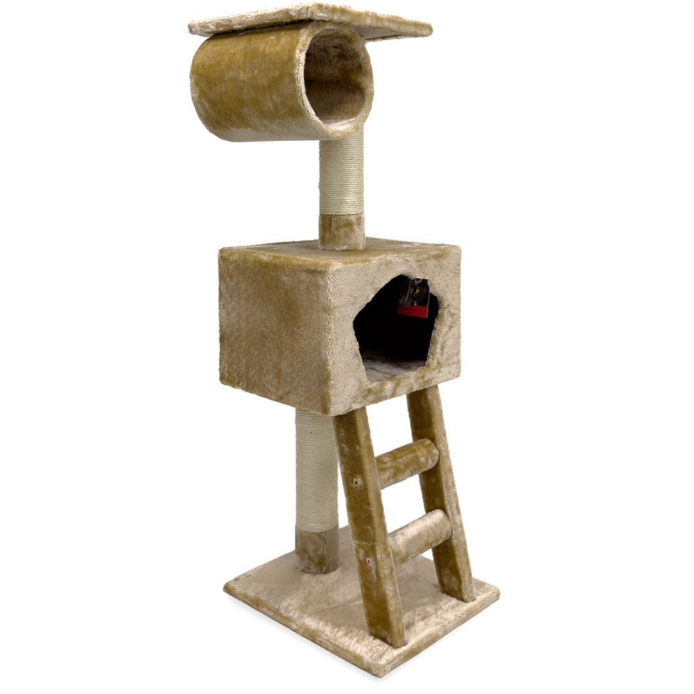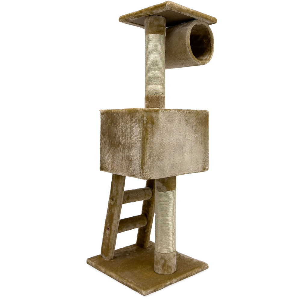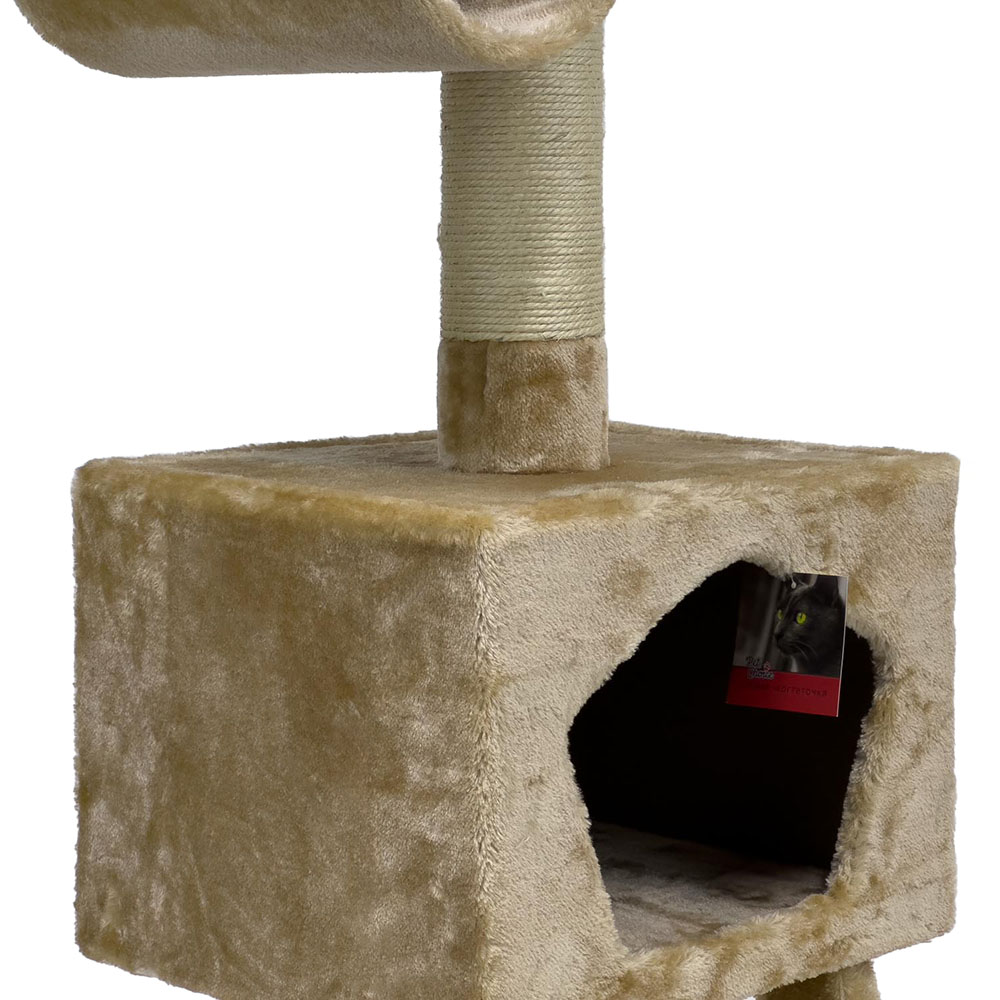 Оригинальная когтеточка-комплекс с размерами 40х35х109см светло-бежевого цвета. Оборудована декоративной, меховой лесенкой, которая ведет в уютный, мягкий домик. Вверху комплекса расположена обзорная площадка и лежанка в форме цилиндра.