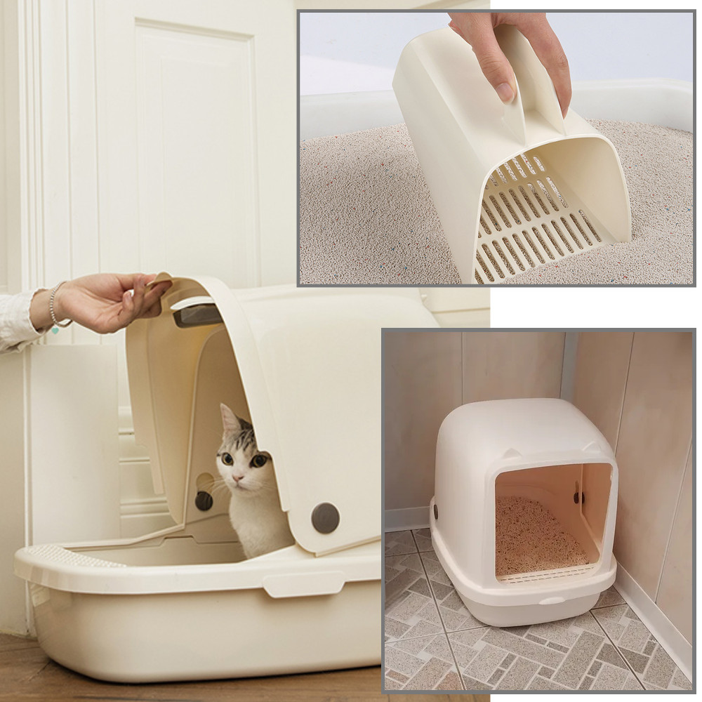 Закрытый туалет Catidea препятствует рассыпанию наполнителя и защищает от неприятного запаха в помещении. Антибактериальное покрытие всех комплектующих туалета Catidea. Крышка плотно прилегает к поддону и фиксируется по бокам ушками – защелками. Совок туалета в форме стакана, предназначен для засыпания наполнителя, удаления комков и чистки туалета.