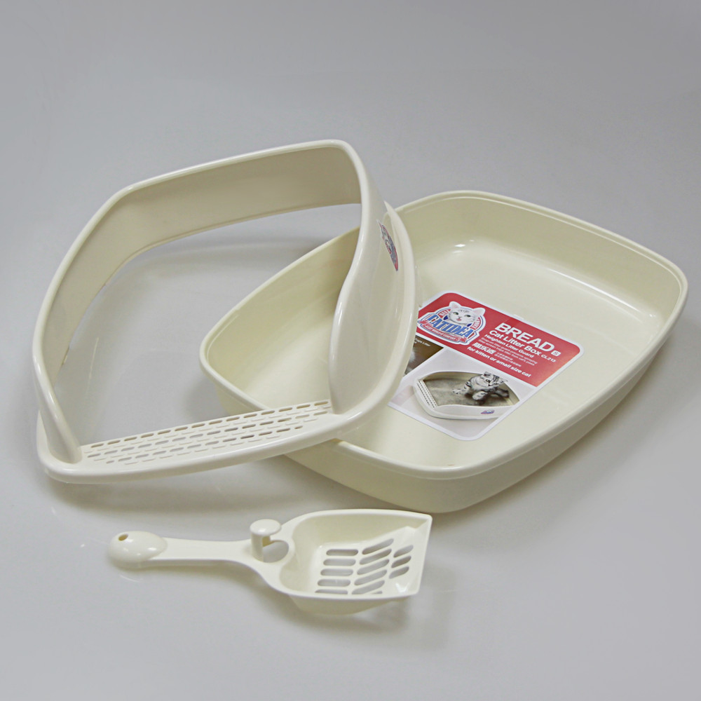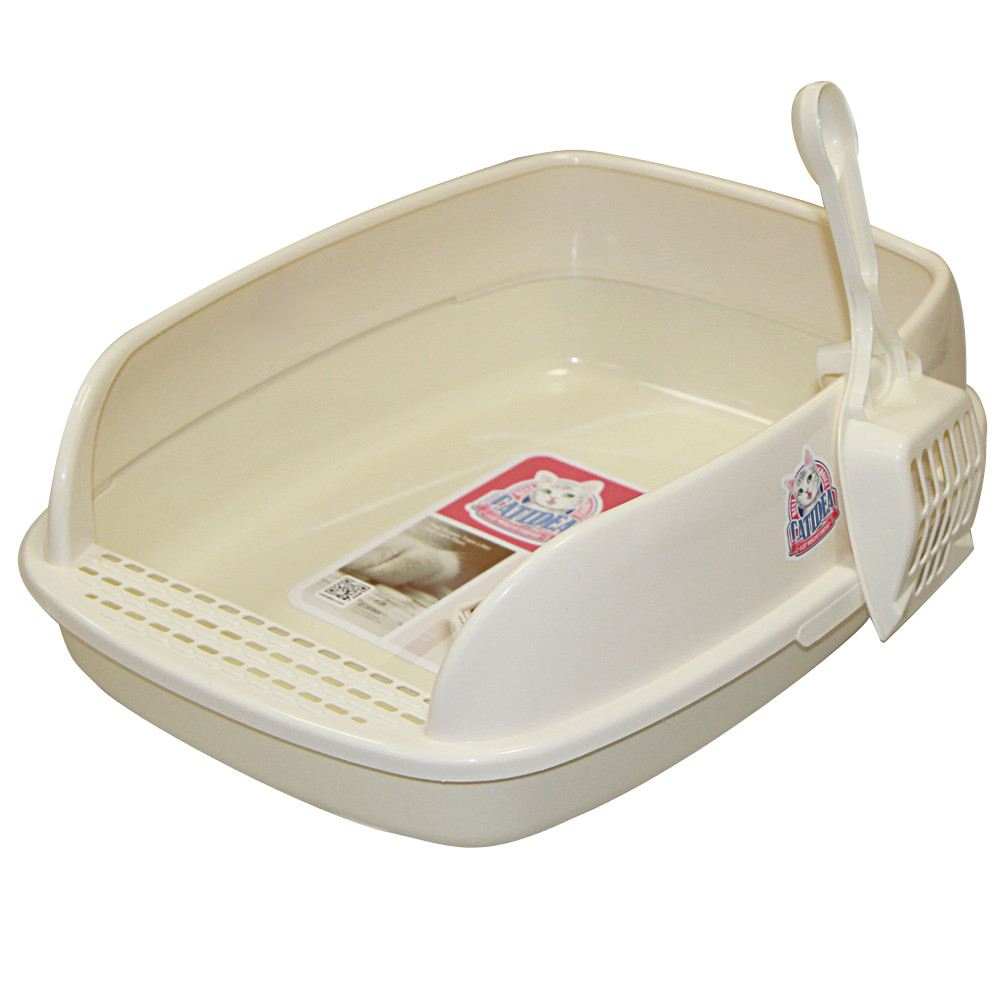 Лоток для кошек кремовый, размером 46х36х15см, с бортом, совок с прорезями входит в комплект.
