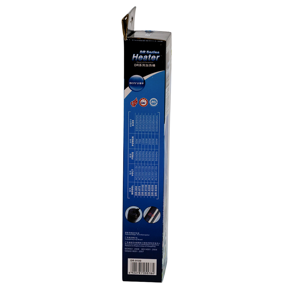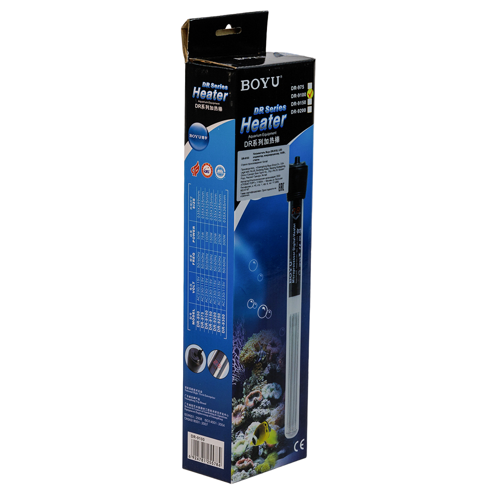 Нагреватель Boyu DR-9100 класса премиум с микропроцессором, терморегулятором и LED индикацией имеет дисплей температуры. Кварцевое стекло. Защита от перегрева. Подходит для морской и пресной воды. Для аквариумов 90-130 л.