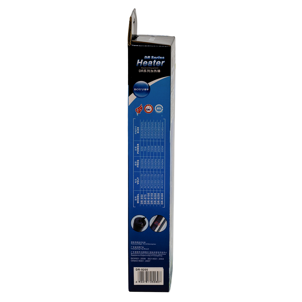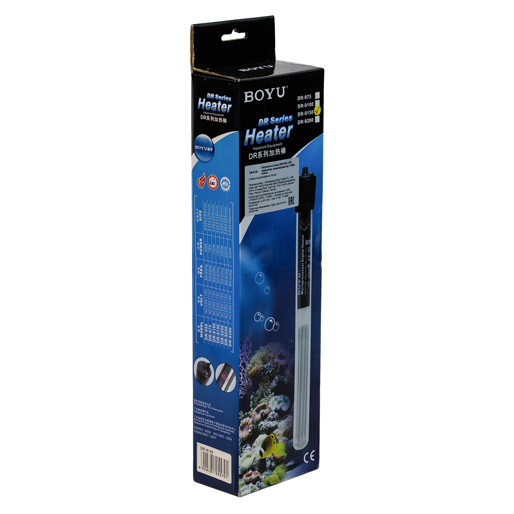 Нагреватель Boyu DR-9150 класса премиум с микропроцессором, терморегулятором и LED индикацией имеет дисплеей температуры. Кварцевое стекло. Защита от перегрева. Подходит для морской и пресной воды. Для аквариумов 130-190 л.