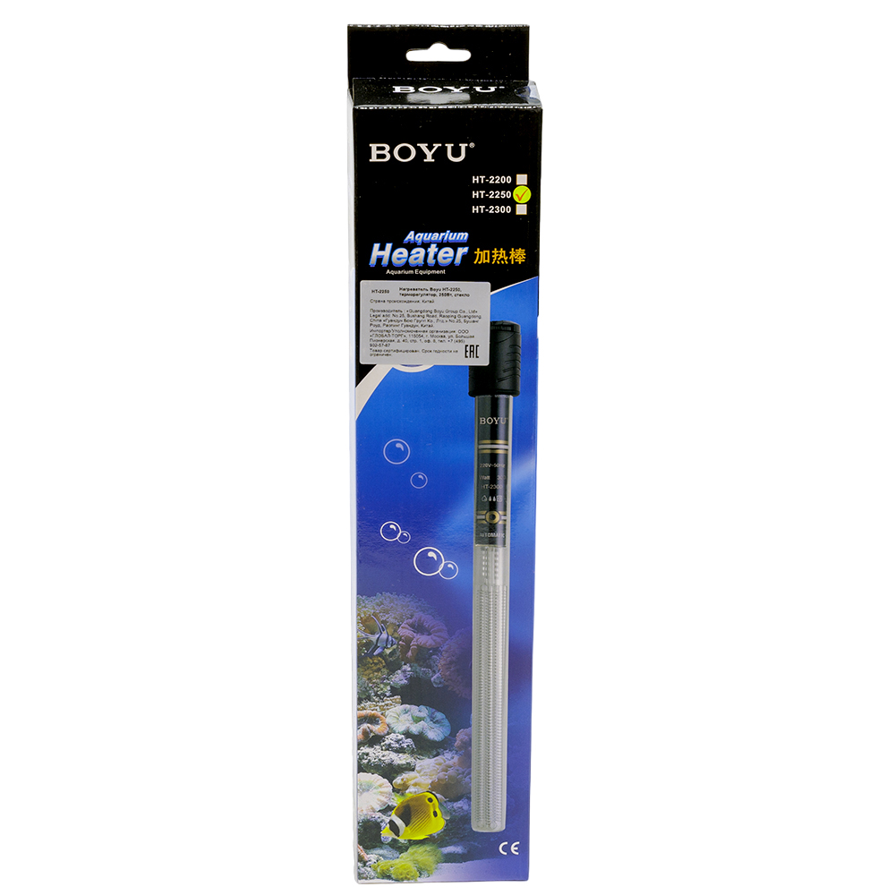 Нагреватель для аквариума Boyu HT-2250 – профессиональное решение для содержания аквариумных рыб и черепах. Стеклянный нагреватель с терморегулятором идеально подходит для аквариумов объемом 190-250 литров, обеспечивая стабильную температуру воды.