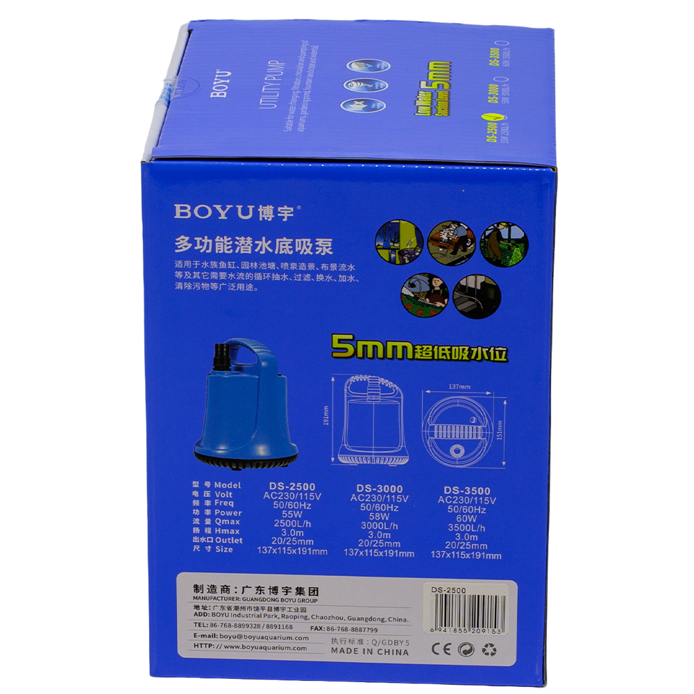 Погружной насос Boyu DS-2500 предназначен для перекачки воды в аквариуме, пруду, баках и в других емкостях.