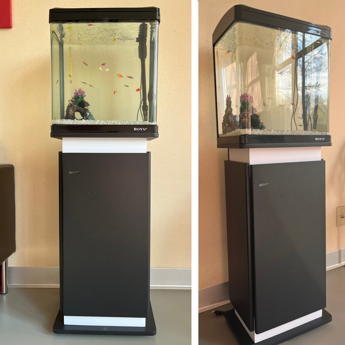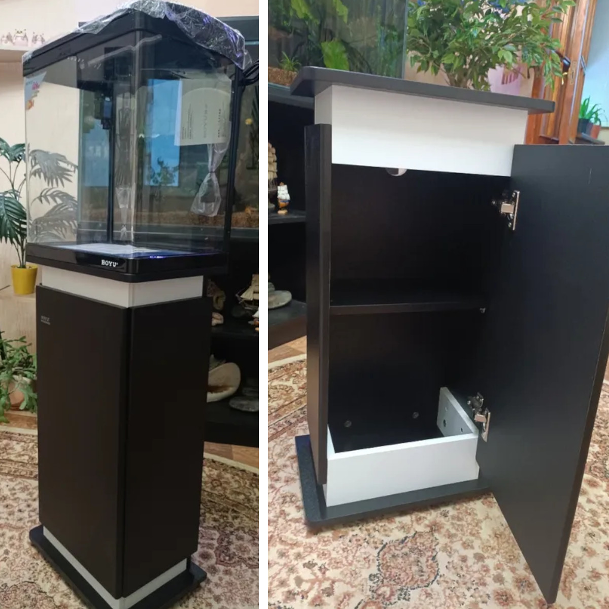 Тумба черная для панорамного аквариума Boyu EC-400 на 33 л. Прочная ровная столешница устойчива к деформации, поэтому стенки наполненной водой емкости защищены от перекашивания.Тумба оснащена шкафчиками, за дверцами которых удобно хранить корм, предметы для ухода за аквариумом и оборудование. Благородный стиль, подойдет под любой интерьер.