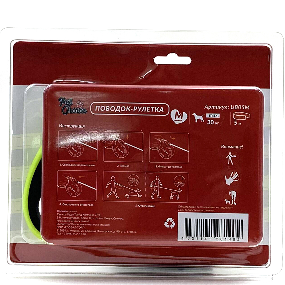 Поводок-рулетка с лентой 5 метров предназначен для выгула собак весом до 30 кг. Ширина ленты 23 мм. Светоотражающая лента автоматически сматывается, поводок в использовании не провисает, таким образом, не пачкается и не перетирается, его не нужно подбирать руками, когда питомец подходит ближе. Длинный поводок даст свободу передвижений вашему питомцу. Имеется кнопка фиксации длины. Удобная ручка, крепкий корпус делают рулетку долговечной.