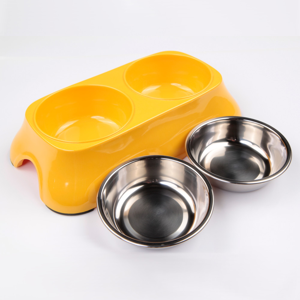 Двойная меламиновая миска со вставками из нержавеющей стали, цвет желтый, предназначена для домашних животных. Размер: 27x15x6 см, 150+150 мл.