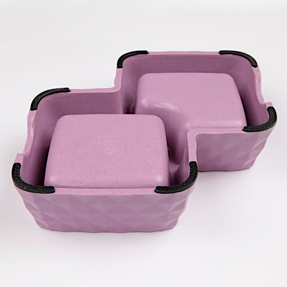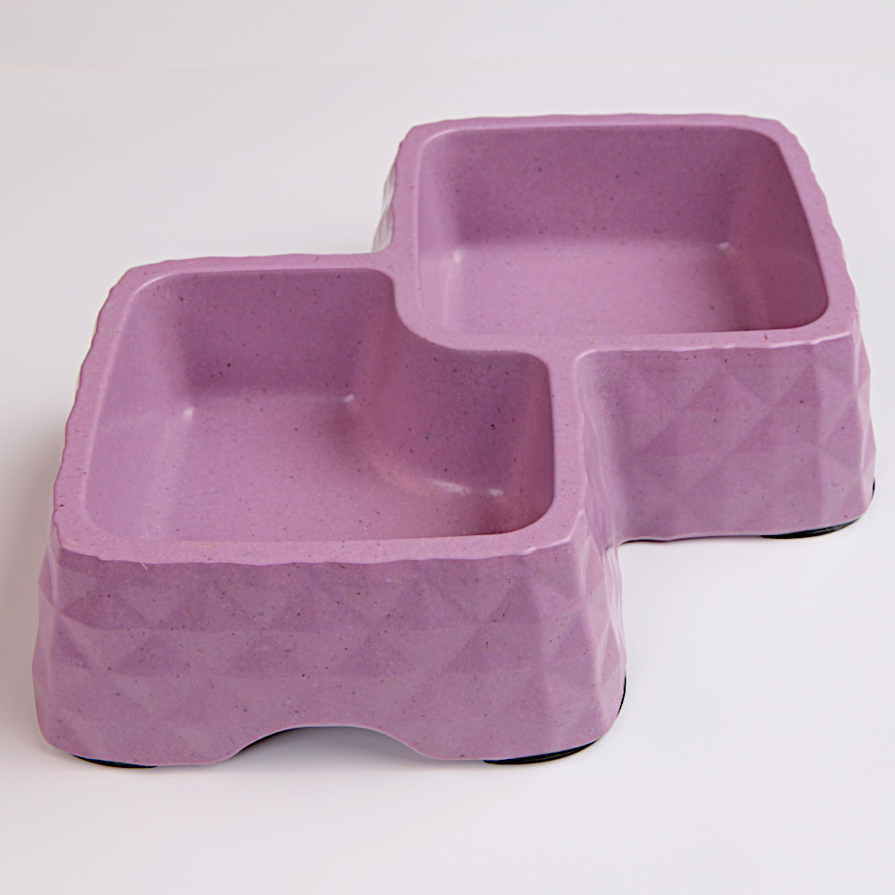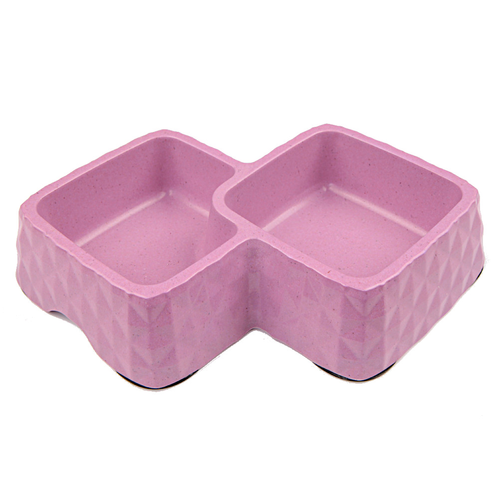 Миска двойная из бамбукового волокна, 29.9x18.9x5.5 см, 360+430 мл, цвет фиолетовый для сухого/влажного корма и воды. Не впитывает запахи, не гнется, миска легко моется, имеет длительный срок эксплуатации. У миски резиновые ножки, которые предотвращают скольжение по полу. Красивый дизайн, яркие цвета в ассортименте.