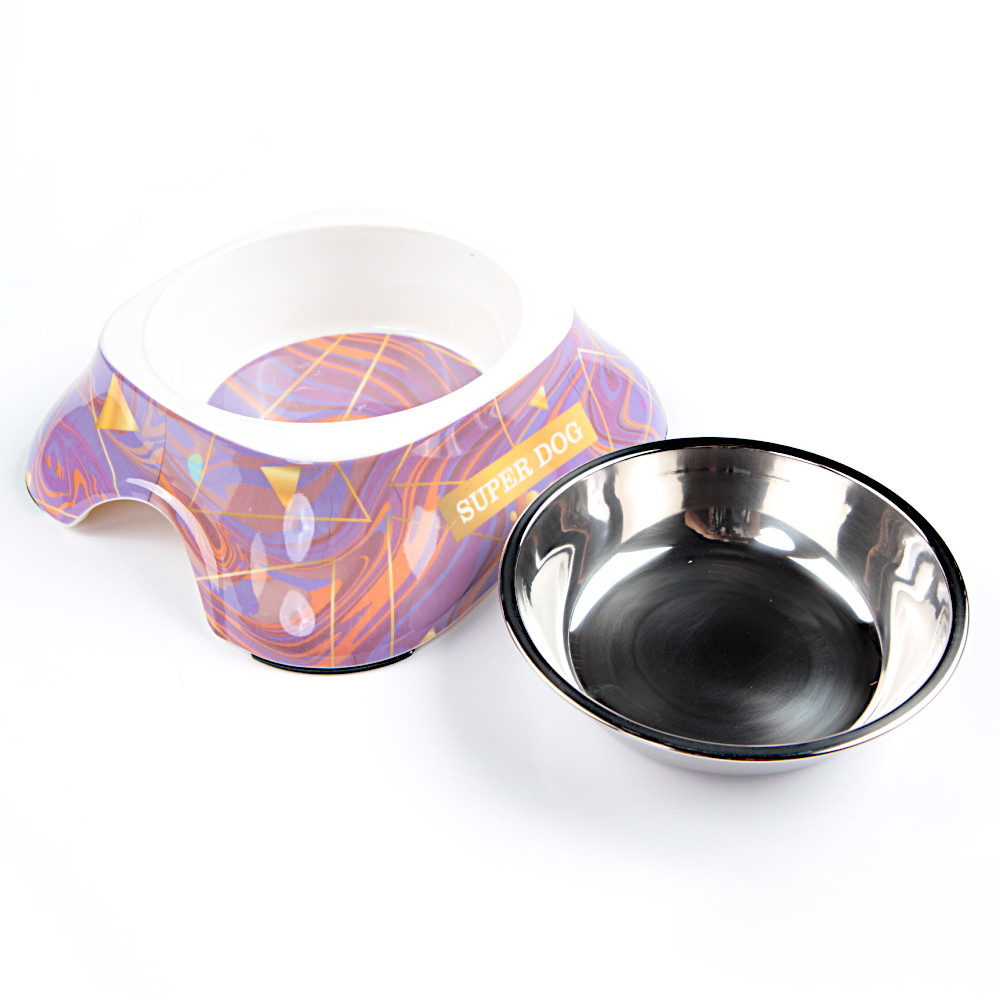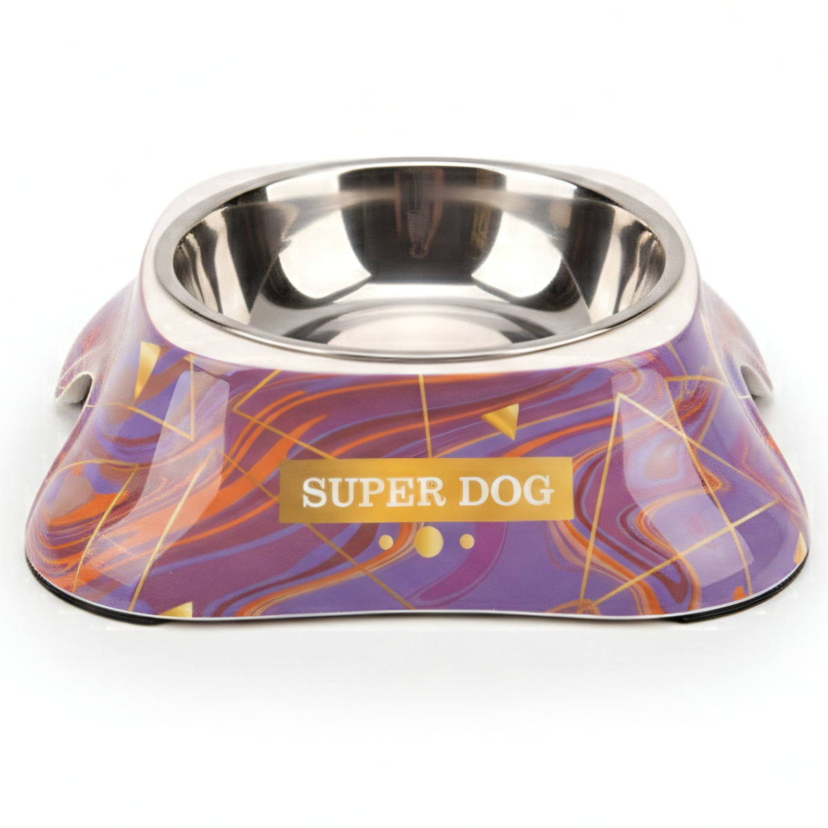 Миска из нержавеющей стали на подставке из меламина A5, 20x21x6 см, цвет фиолетовый с надписью Super Dog. Миска на подставке идеально подходит для домашних животных, собак и кошек. Блюдце из нержавеющей стали вынимается, что очень удобно при мытье миски.