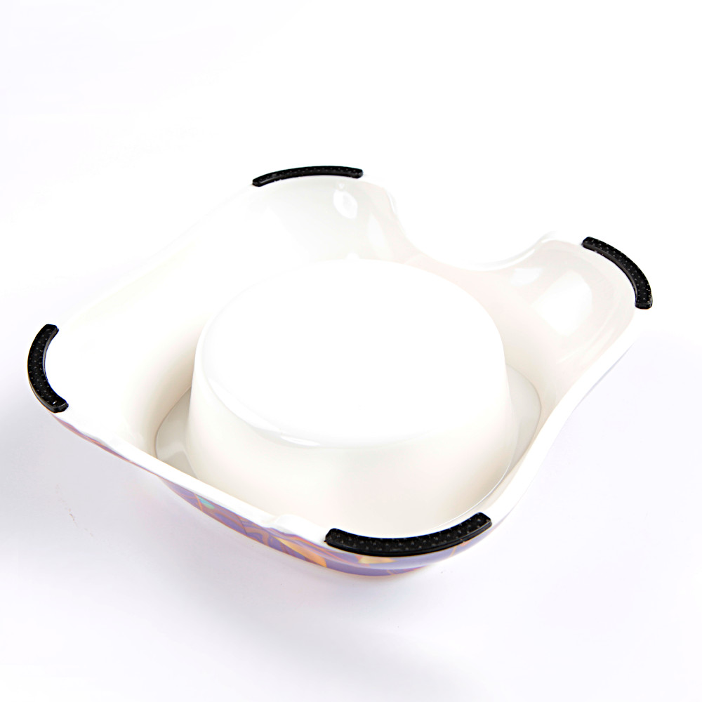 Подходит как для воды, так и для корма, специальные ножки с резиновыми накладками предупреждают скольжение. Миска устойчивая, благодаря расширяющемуся основанию. Оригинальный принт и разнообразие цветов.