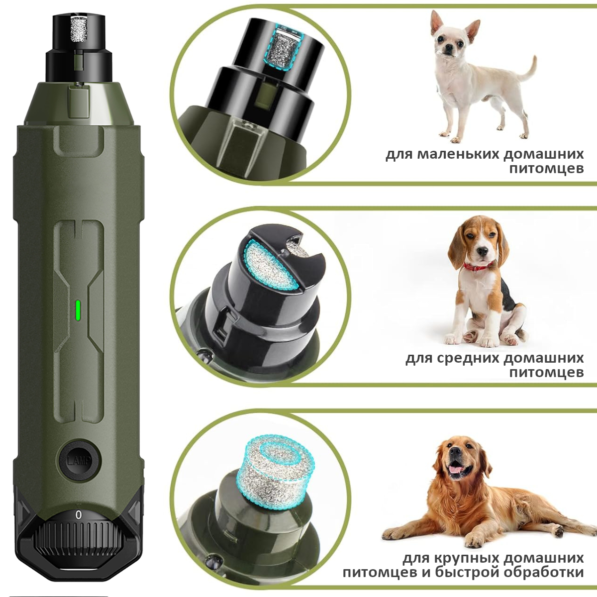 Перезаряжаемый и портативный гриндер для кошек и собак Petwant N60 в зеленом корпусе - представляет собой электрический когтерез, не травмирующий когти и значительно облегчающий владельцу уход за питомцем. Является одной из самых мощных шлифовальных машин на рынке. Подходит для маленьких, средних, крупных собак, кошек и других животных. Специальный валик стачивает когти, а абразивное покрытие на насадке их шлифует.