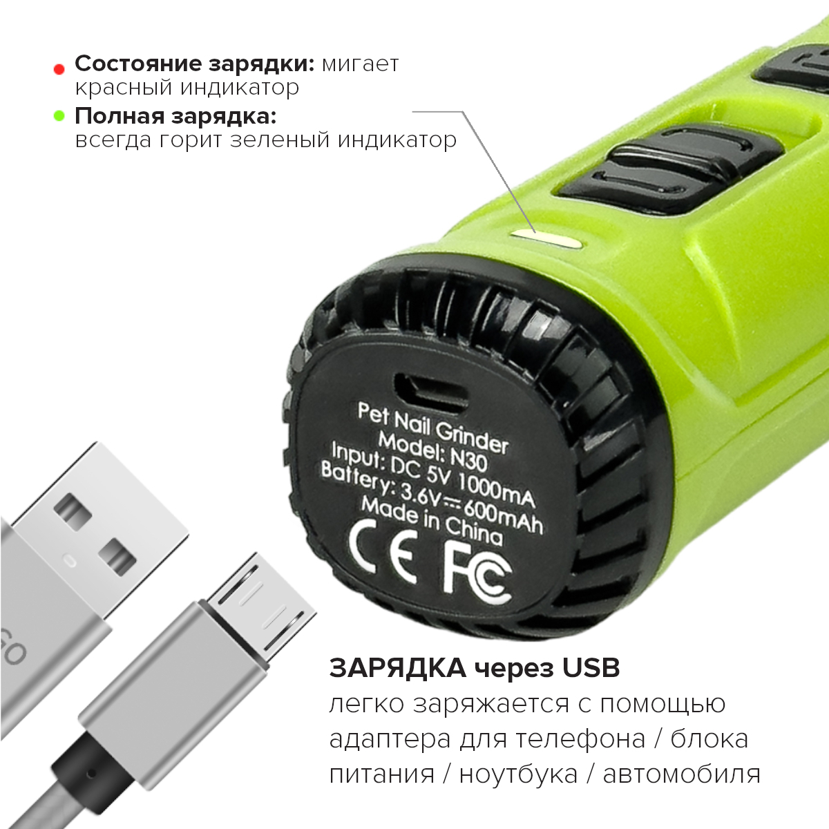 Перезаряжаемый гриндер для кошек и собак Petwant N30 в зеленом корпусе - представляет собой электрический когтерез, не травмирующий когти и значительно облегчающий владельцу уход за питомцем. Подходит для средних, крупных собак, кошек и других животных. Специальный валик стачивает когти, а абразивное покрытие на насадке их шлифует.