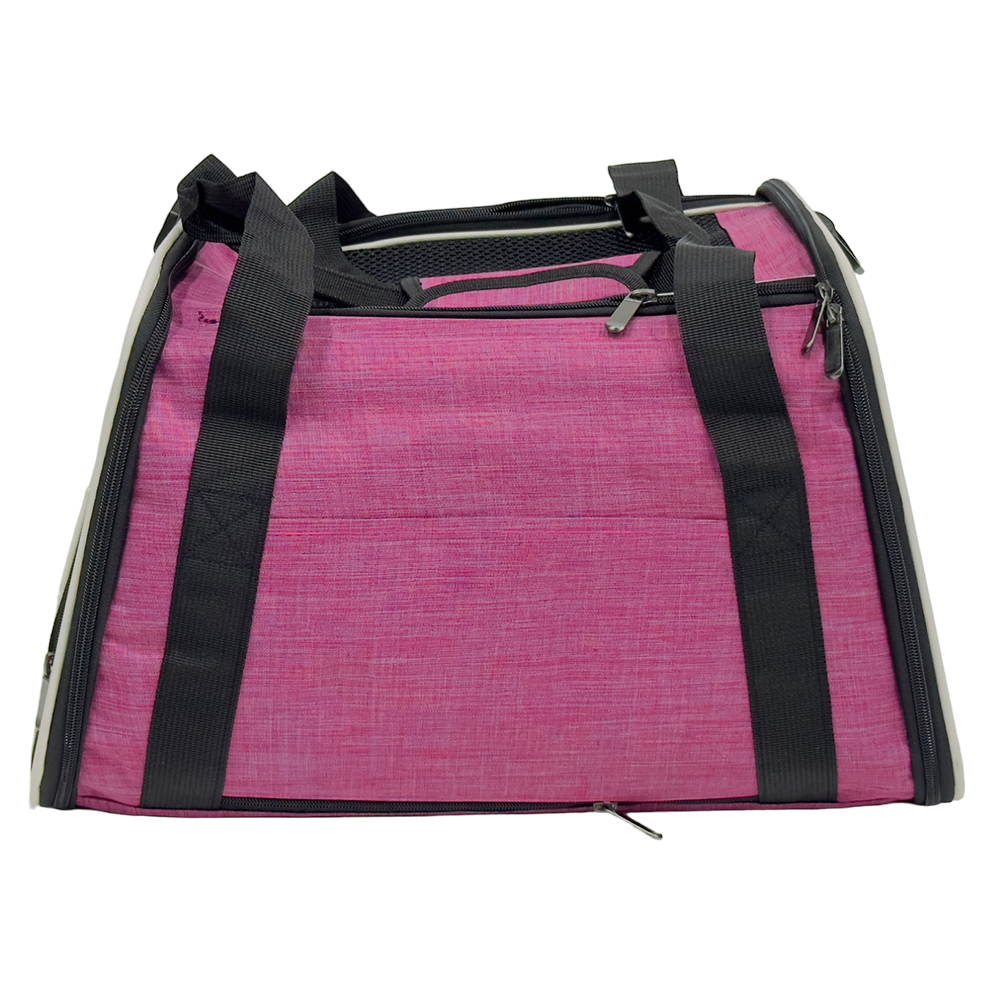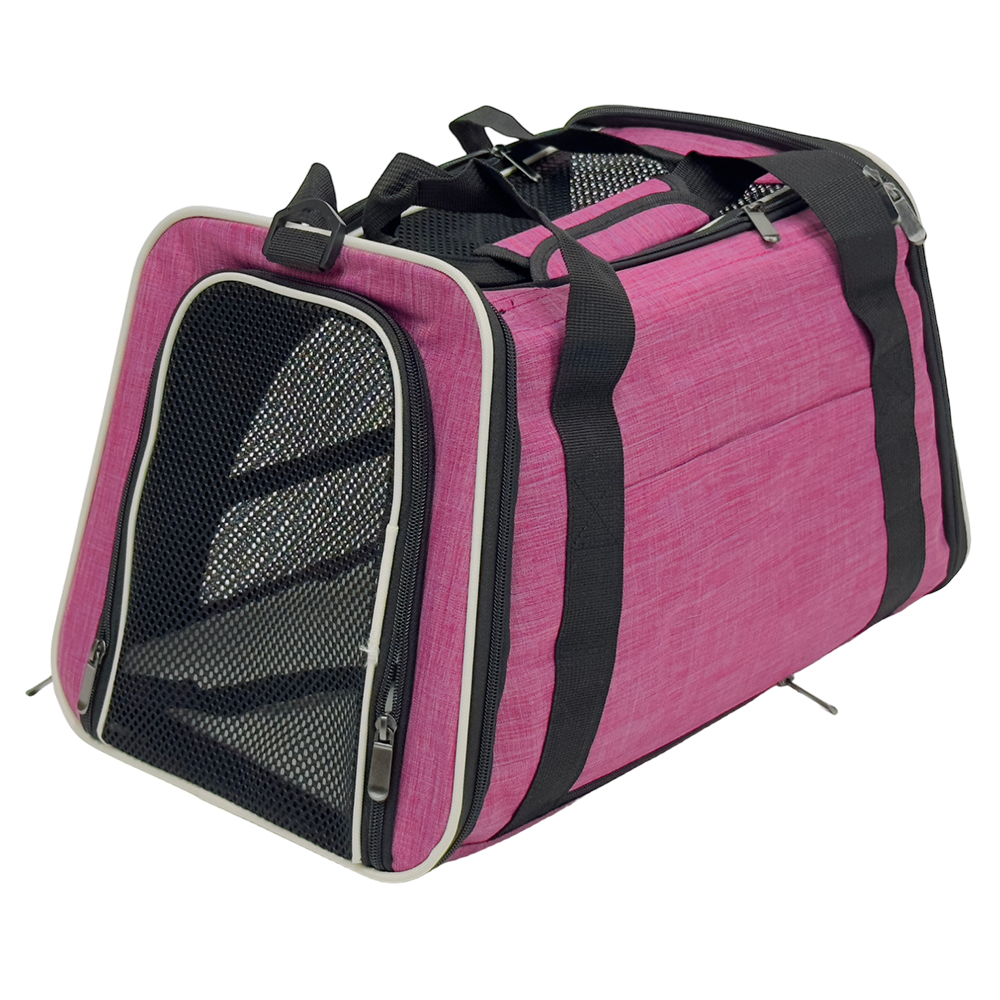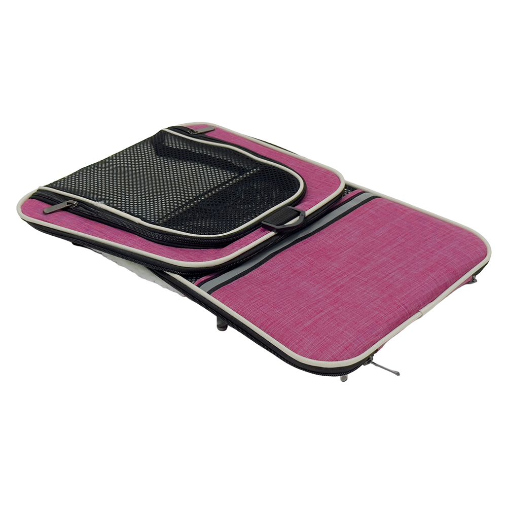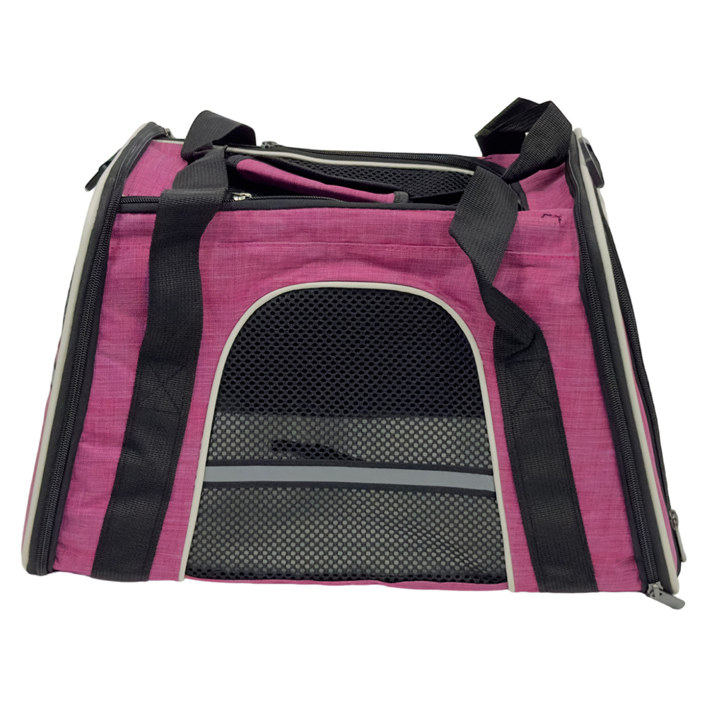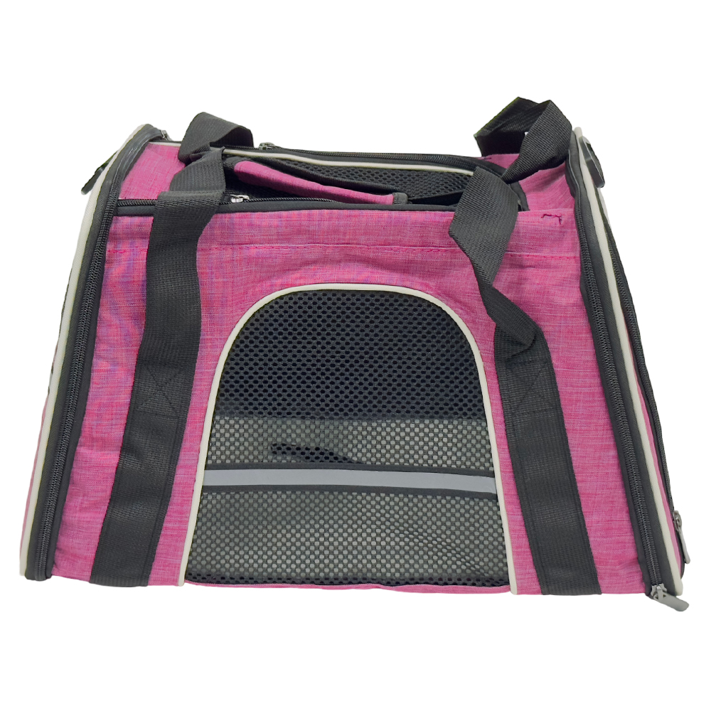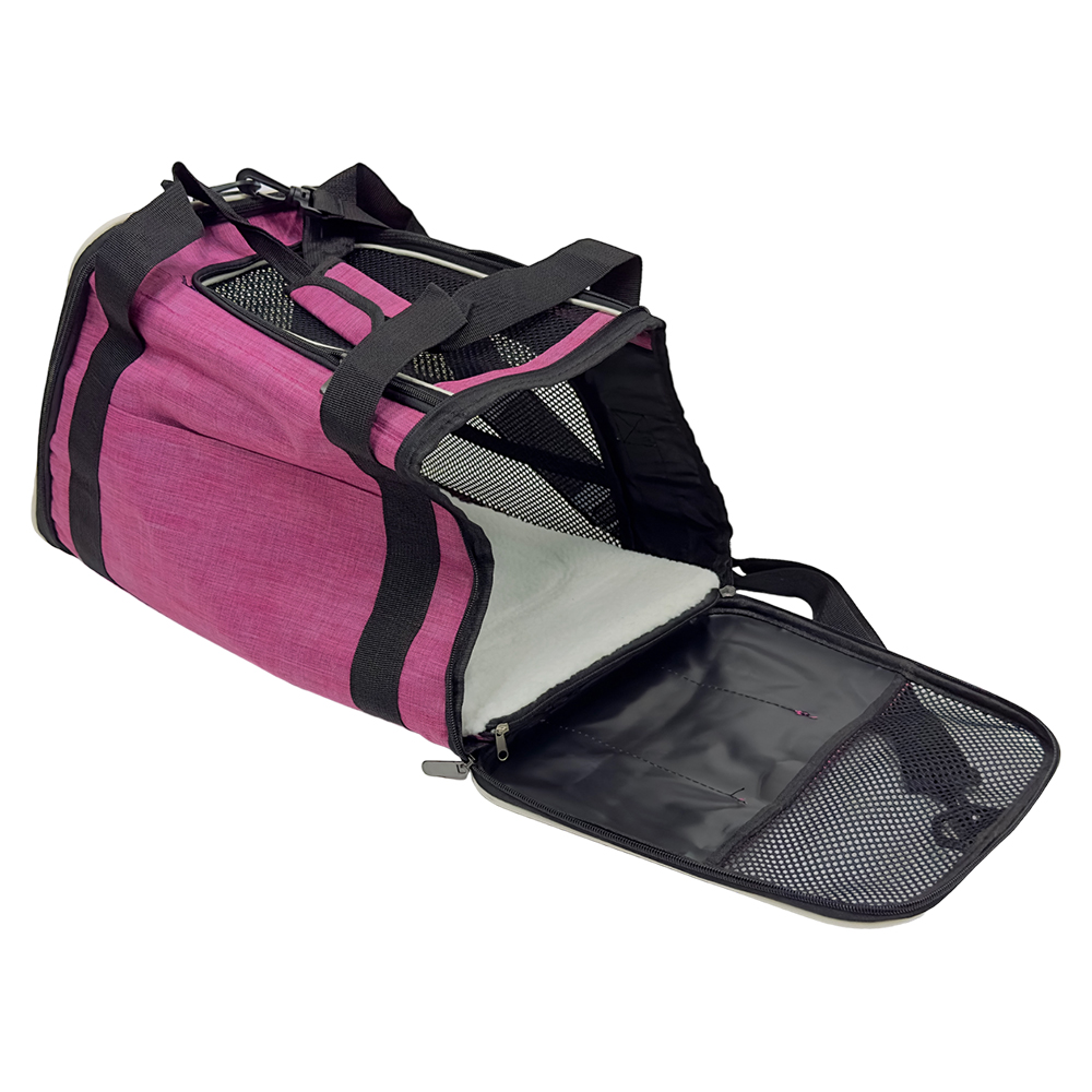 Складная сумка переноска для собак и кошек изготовлена из плотной синтетической ткани. Открывается с разных сторон и сверху.