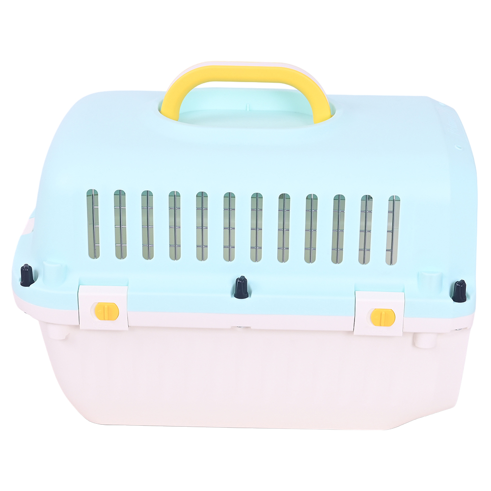 Это яркая пластиковая переноска-контейнер для кошек и собак HC040-L50B от Pet Choice, которая сочетает в себе функциональность и стиль. Верхняя часть выполнена в приятном голубом цвете, нижняя - в кремовом, а ручка и дополнительные элементы - в ярком желтом цвете, что придает переноске уникальный и привлекательный вид.