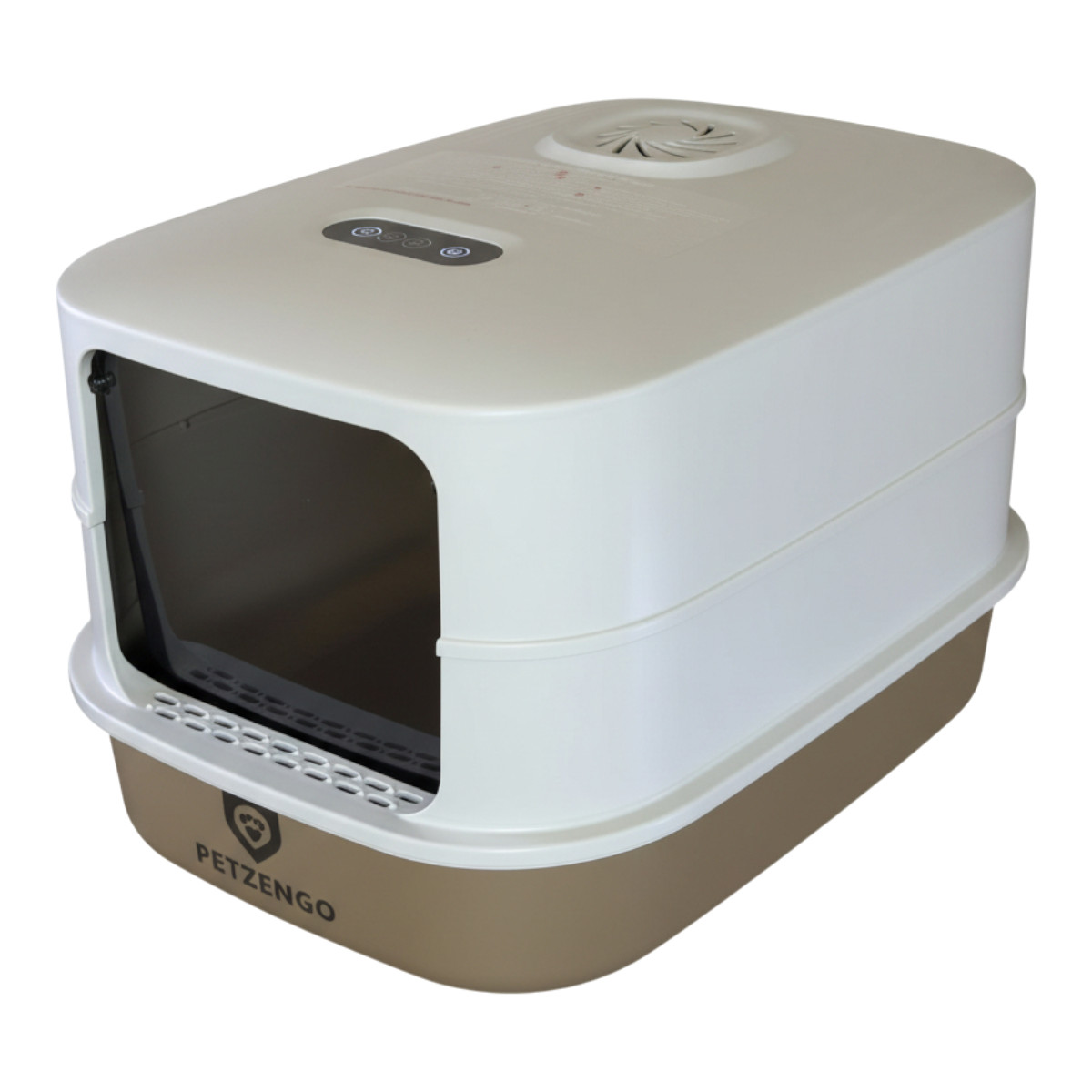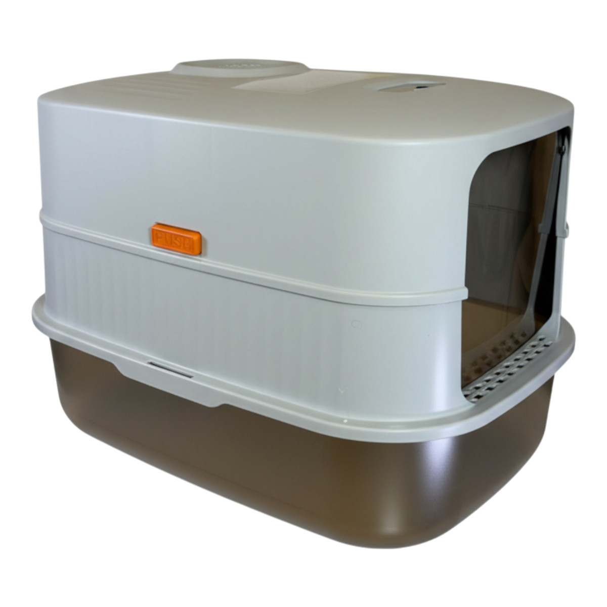 Этот закрытый туалет премиум-класса оснащён умной системой устранения запахов и встроенным инфракрасным датчиком. Основной вентилятор выдувает положительные и отрицательные ионы во внутреннюю часть лотка для туалета. Рециркуляционный вентилятор забирает воздух из лотка обратно к основному вентилятору, обеспечивая эффект внутренней циркуляции воздуха.
